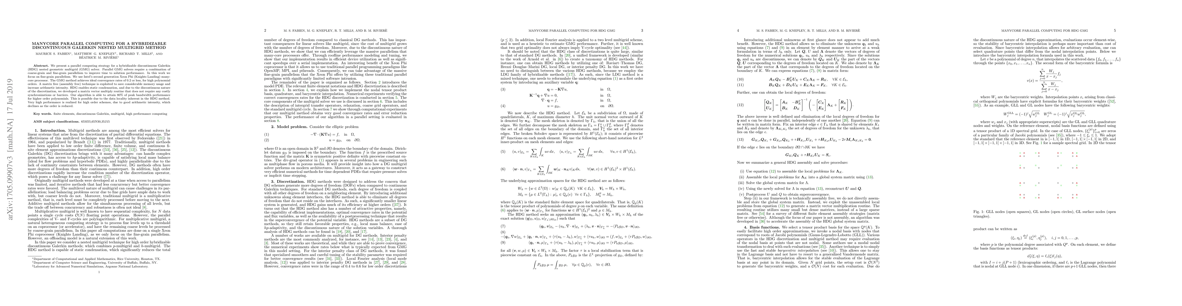 This paper presents a parallel computing strategy for a hybridizable discontinuous Galerkin nested geometric multigrid solver on Intel's Xeon Phi many-core processor, achieving 80% of peak bandwidth performance for high polynomial orders through efficient data locality and matrix-free techniques.
