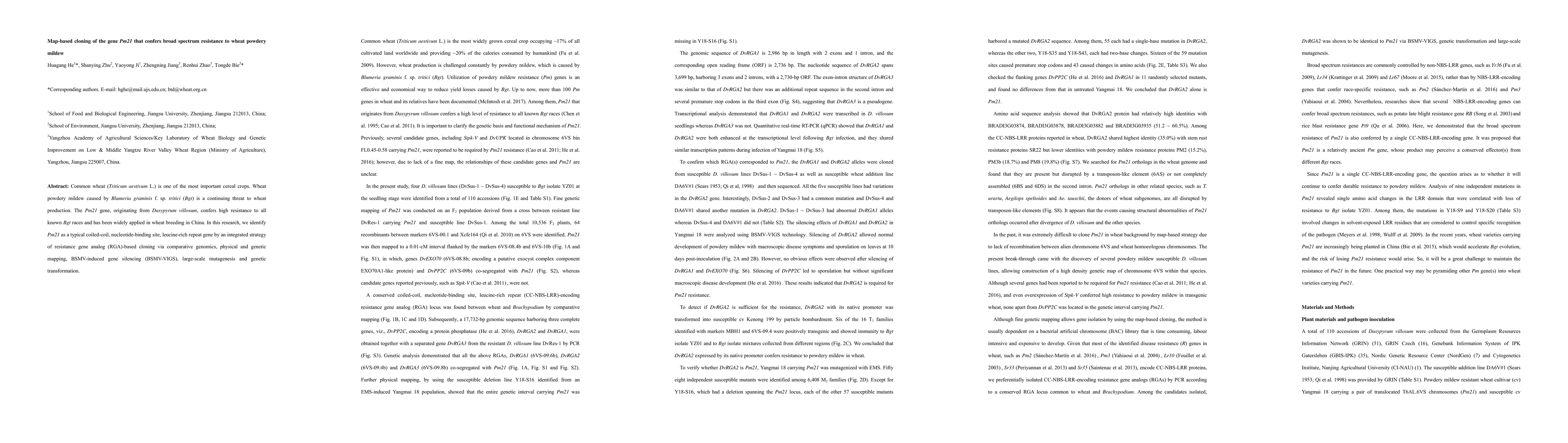 Common wheat (Triticum aestivum L.) is one of the most important cereal crops. Wheat powdery mildew caused by Blumeria graminis f. sp. tritici (Bgt) is a continuing threat to wheat production. The Pm21 gene, originating from Dasypyrum villosum, confers high resistance to all known Bgt races and has been widely applied in wheat breeding in China. In this research, we identify Pm21 as a typical coiled-coil, nucleotide-binding site, leucine-rich repeat gene by an integrated strategy of resistance gene analog (RGA)-based cloning via comparative genomics, physical and genetic mapping, BSMV-induced gene silencing (BSMV-VIGS), large-scale mutagenesis and genetic transformation.