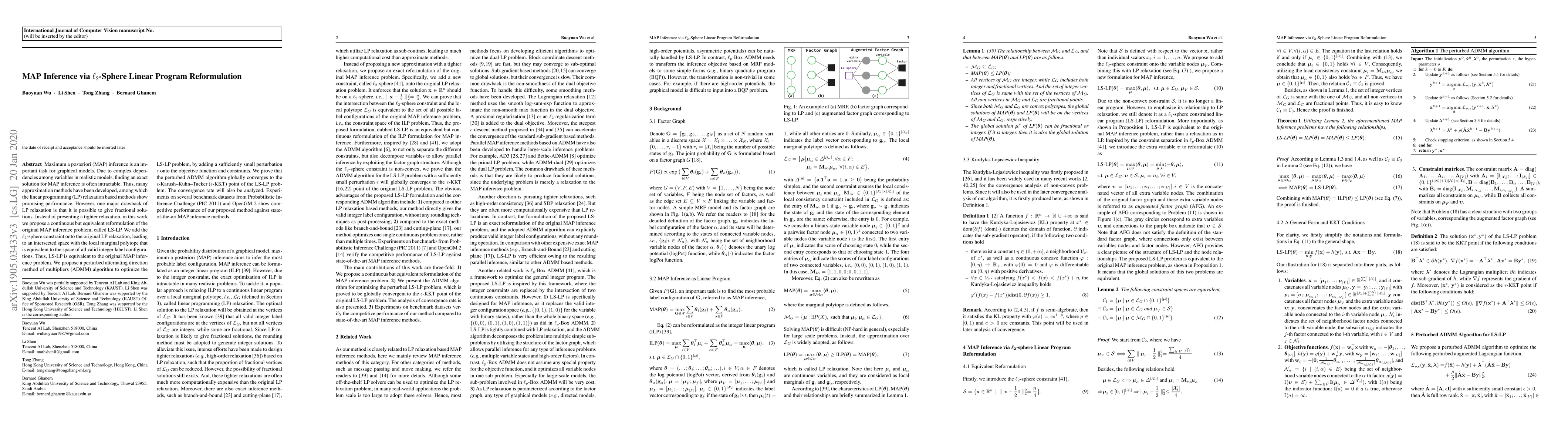 This paper proposes a reformulation of the MAP inference problem using an L2-sphere linear program (LS-LP) to avoid fractional solutions. It introduces a perturbed ADMM algorithm for optimization and proves global convergence, demonstrating competitive performance on benchmark datasets.