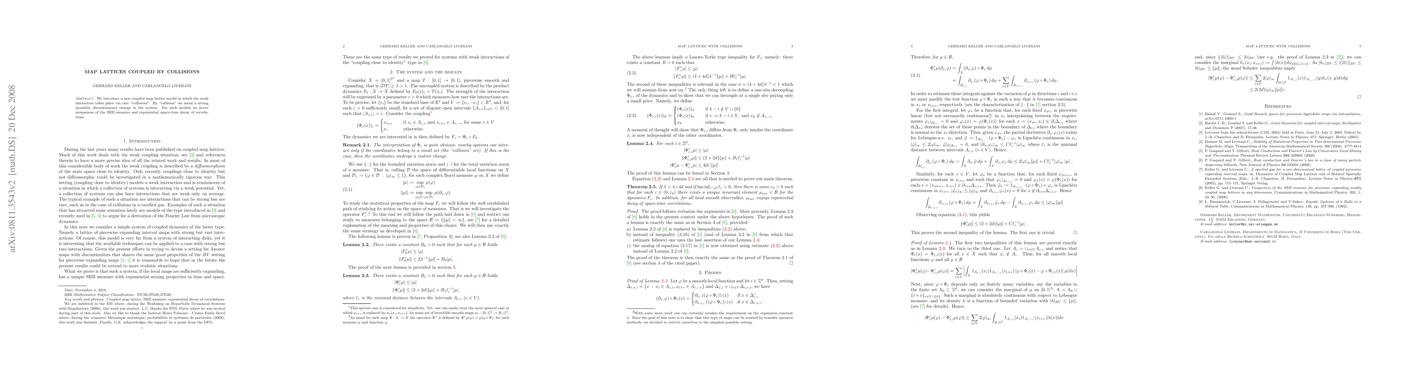 We introduce a new coupled map lattice model in which the weak interaction takes place via rare "collisions". By "collision" we mean a strong (possibly discontinuous) change in the system. For such models we prove uniqueness of the SRB measure and exponential space-time decay of correlations.