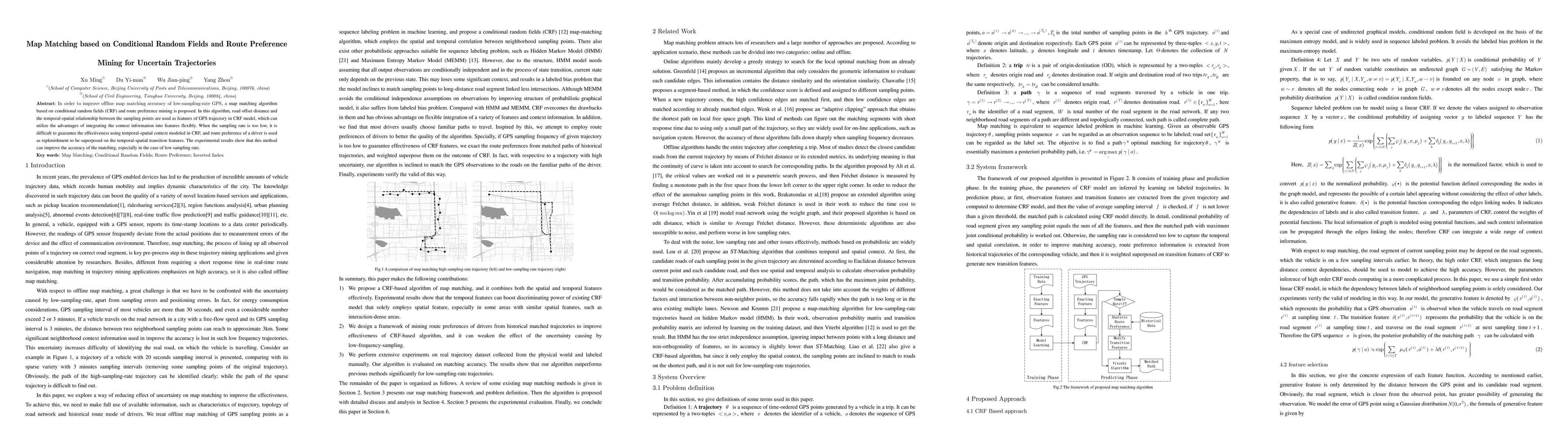 This paper proposes a map matching algorithm using conditional random fields (CRF) and route preference mining to enhance offline accuracy for low-sampling-rate GPS data. The method integrates road offset and temporal-spatial relationships, supplemented by driver's route preferences to improve matching accuracy, especially when sampling rates are low.