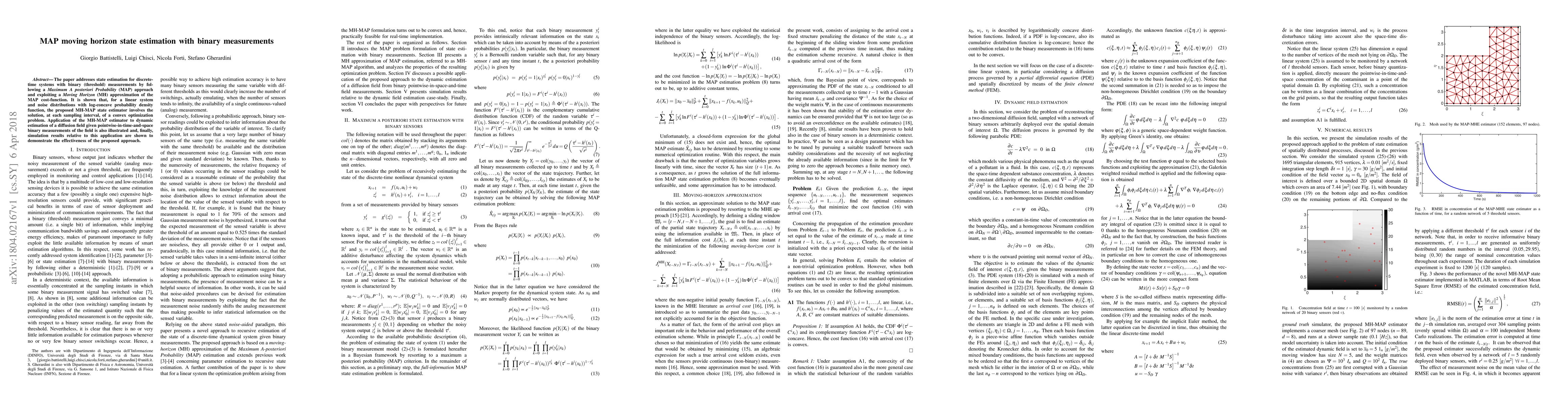 The paper addresses state estimation for discrete-time systems with binary (threshold) measurements by following a Maximum A posteriori Probability (MAP) approach and exploiting a Moving Horizon (MH) approximation of the MAP cost-function. It is shown that, for a linear system and noise distributions with log-concave probability density function, the proposed MH-MAP state estimator involves the solution, at each sampling interval, of a convex optimization problem. Application of the MH-MAP estimator to dynamic estimation of a diffusion field given pointwise-in-time-and-space binary measurements of the field is also illustrated and, finally, simulation results relative to this application are shown to demonstrate the effectiveness of the proposed approach.