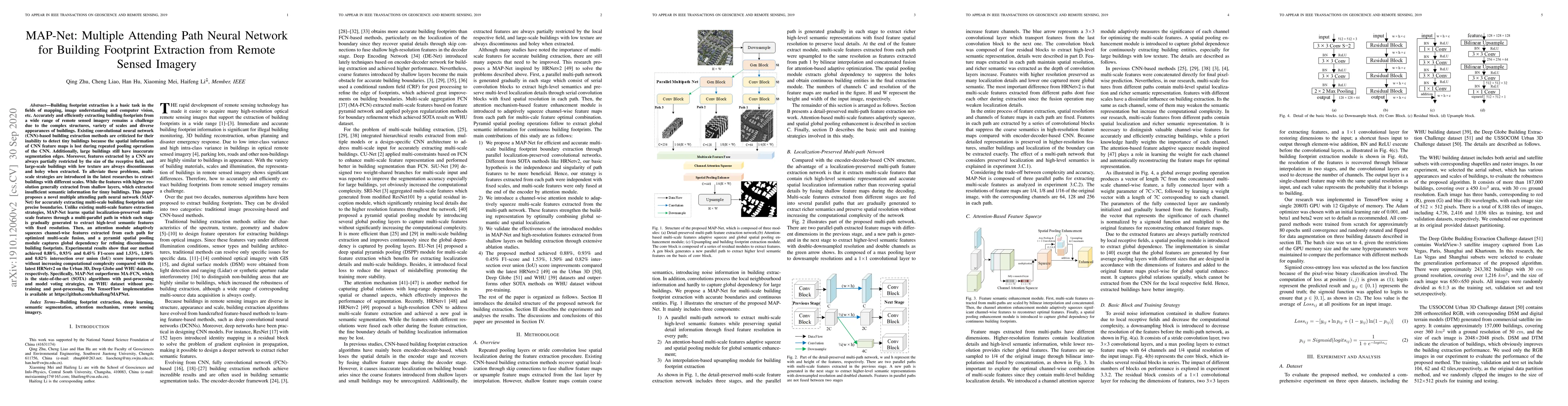 MAP-Net introduces a multi attending path neural network to extract multiscale building footprints from remote sensed imagery, addressing the limitations of existing CNN-based methods. It achieves improved precision and IoU scores by preserving spatial localization and refining building boundaries, outperforming state-of-the-art algorithms without increased computational complexity.