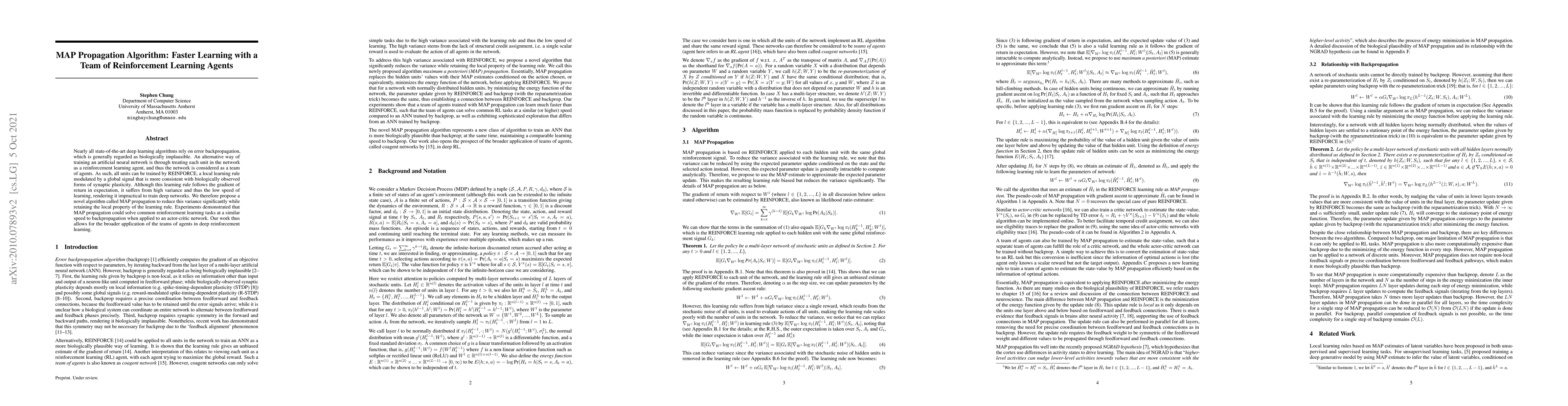 Nearly all state-of-the-art deep learning algorithms rely on error backpropagation, which is generally regarded as biologically implausible. An alternative way of training an artificial neural network is through treating each unit in the network as a reinforcement learning agent, and thus the network is considered as a team of agents. As such, all units can be trained by REINFORCE, a local learning rule modulated by a global signal that is more consistent with biologically observed forms of synaptic plasticity. Although this learning rule follows the gradient of return in expectation, it suffers from high variance and thus the low speed of learning, rendering it impractical to train deep networks. We therefore propose a novel algorithm called MAP propagation to reduce this variance significantly while retaining the local property of the learning rule. Experiments demonstrated that MAP propagation could solve common reinforcement learning tasks at a similar speed to backpropagation when applied to an actor-critic network. Our work thus allows for the broader application of the teams of agents in deep reinforcement learning.