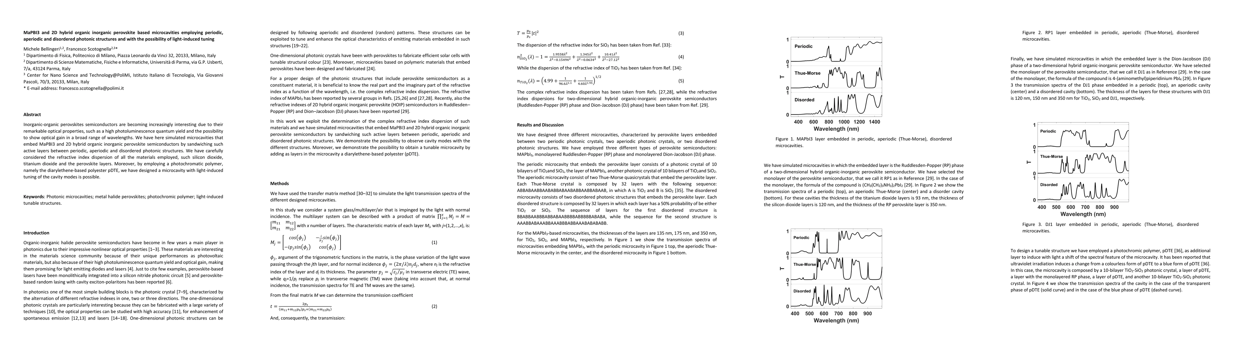 This research simulates microcavities embedding MaPBI3 and 2D hybrid perovskite semiconductors, using various photonic structures, and explores their optical properties, including tunable cavity modes facilitated by a photochromatic polymer. The study focuses on the refractive index dispersion of materials like silicon dioxide, titanium dioxide, and perovskite layers.