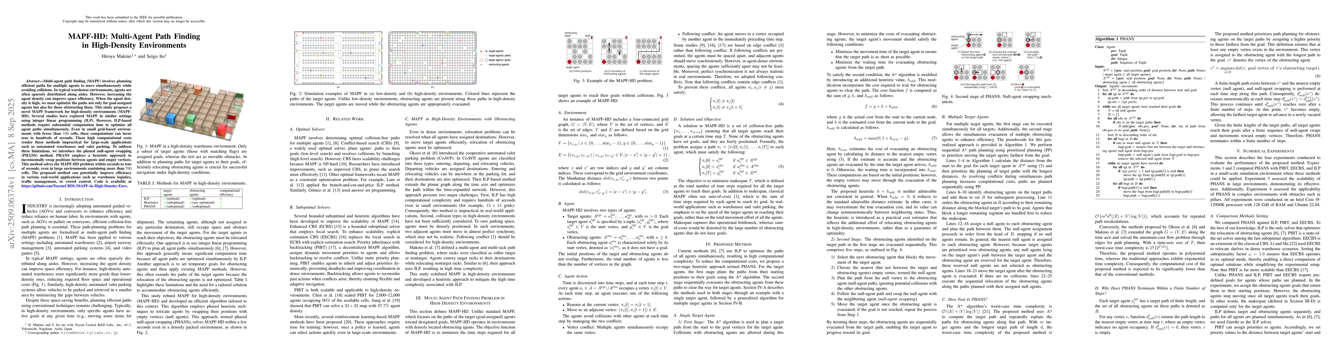 Multi-agent path finding (MAPF) involves planning efficient paths for multiple agents to move simultaneously while avoiding collisions. In typical warehouse environments, agents are often sparsely distributed along aisles. However, increasing the agent density can improve space efficiency. When the agent density is high, we must optimize the paths not only for goal-assigned agents but also for those obstructing them. This study proposes a novel MAPF framework for high-density environments (MAPF-HD). Several studies have explored MAPF in similar settings using integer linear programming (ILP). However, ILP-based methods require substantial computation time to optimize all agent paths simultaneously. Even in small grid-based environments with fewer than $100$ cells, these computations can incur tens to hundreds of seconds. These high computational costs render these methods impractical for large-scale applications such as automated warehouses and valet parking. To address these limitations, we introduce the phased null-agent swapping (PHANS) method. PHANS employs a heuristic approach to incrementally swap positions between agents and empty vertices. This method solves the MAPF-HD problem within seconds to tens of seconds, even in large environments containing more than $700$ cells. The proposed method can potentially improve efficiency in various real-world applications such as warehouse logistics, traffic management, or crowd control. Code is available at https://github.com/ToyotaCRDL/MAPF-in-High-Density-Envs.