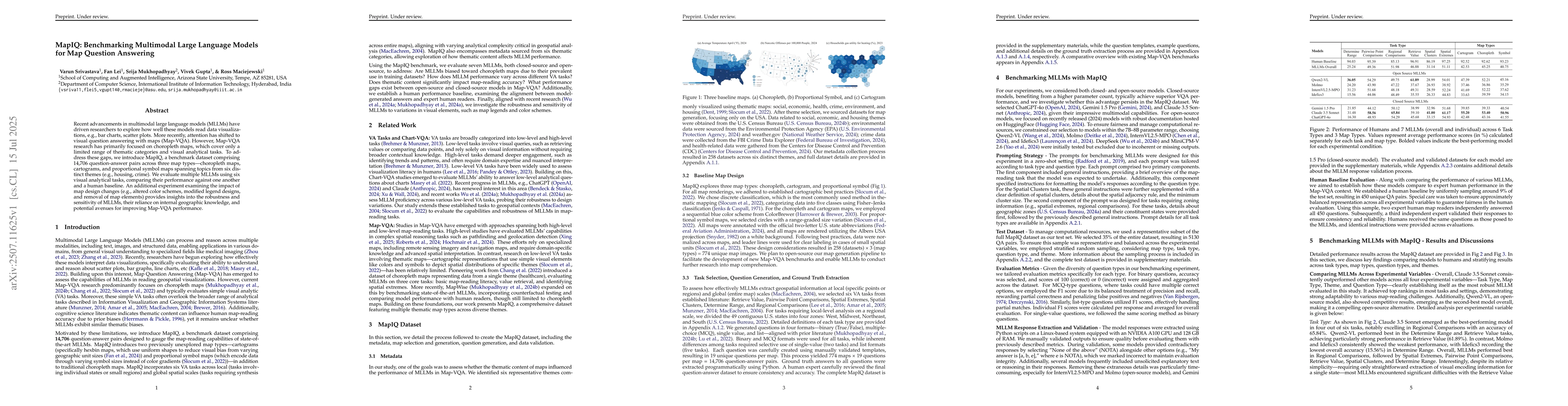 Recent advancements in multimodal large language models (MLLMs) have driven researchers to explore how well these models read data visualizations, e.g., bar charts, scatter plots. More recently, attention has shifted to visual question answering with maps (Map-VQA). However, Map-VQA research has primarily focused on choropleth maps, which cover only a limited range of thematic categories and visual analytical tasks. To address these gaps, we introduce MapIQ, a benchmark dataset comprising 14,706 question-answer pairs across three map types: choropleth maps, cartograms, and proportional symbol maps spanning topics from six distinct themes (e.g., housing, crime). We evaluate multiple MLLMs using six visual analytical tasks, comparing their performance against one another and a human baseline. An additional experiment examining the impact of map design changes (e.g., altered color schemes, modified legend designs, and removal of map elements) provides insights into the robustness and sensitivity of MLLMs, their reliance on internal geographic knowledge, and potential avenues for improving Map-VQA performance.