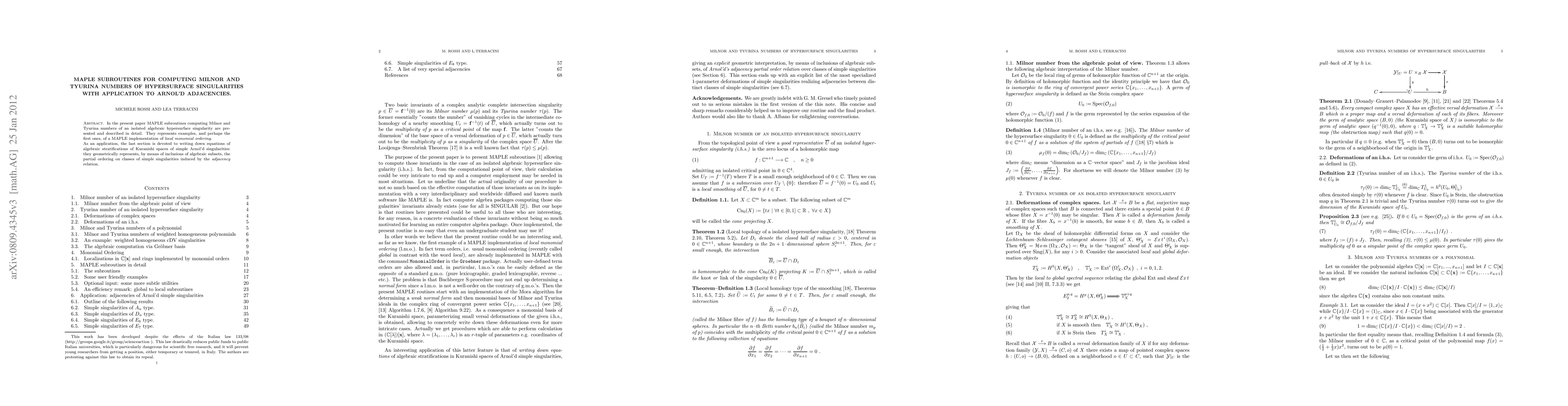 In the present paper MAPLE subroutines computing Milnor and Tyurina numbers of an isolated algebraic hypersurface singularity are presented and described in detail. They represents examples, and perhaps the first ones, of a MAPLE implementation of local monomial ordering. As an application, the last section is devoted to writing down equations of algebraic stratifications of Kuranishi spaces of simple Arnol'd singularities: they geometrically represents, by means of inclusions of algebraic subsets, the partial ordering on classes of simple singularities induced by the adjacency relation.