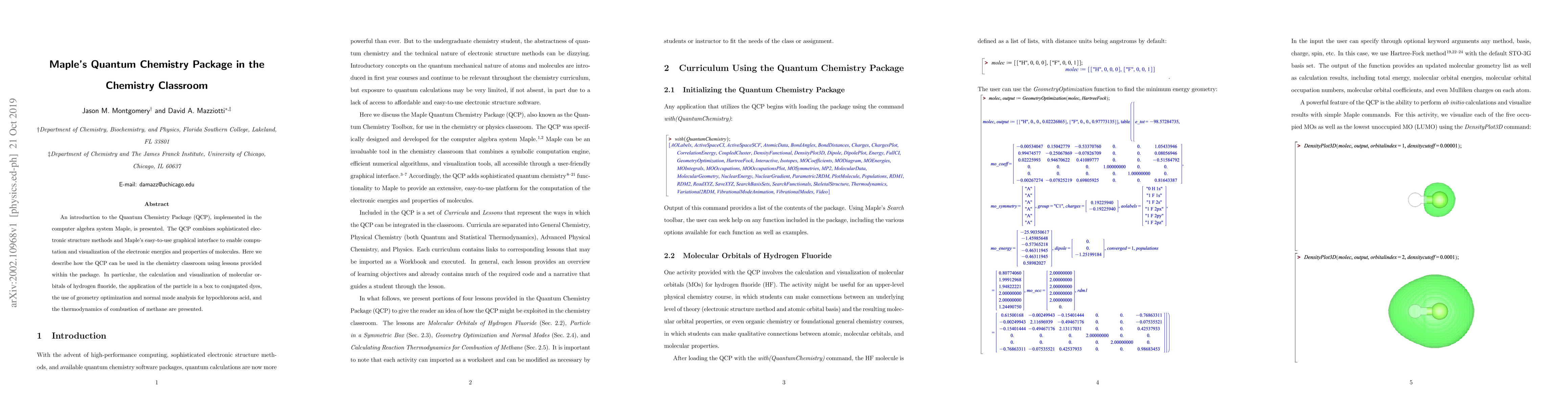 This research demonstrates the utility of Maple's Quantum Chemistry Package in teaching quantum chemistry concepts, highlighting its potential to enhance student understanding.