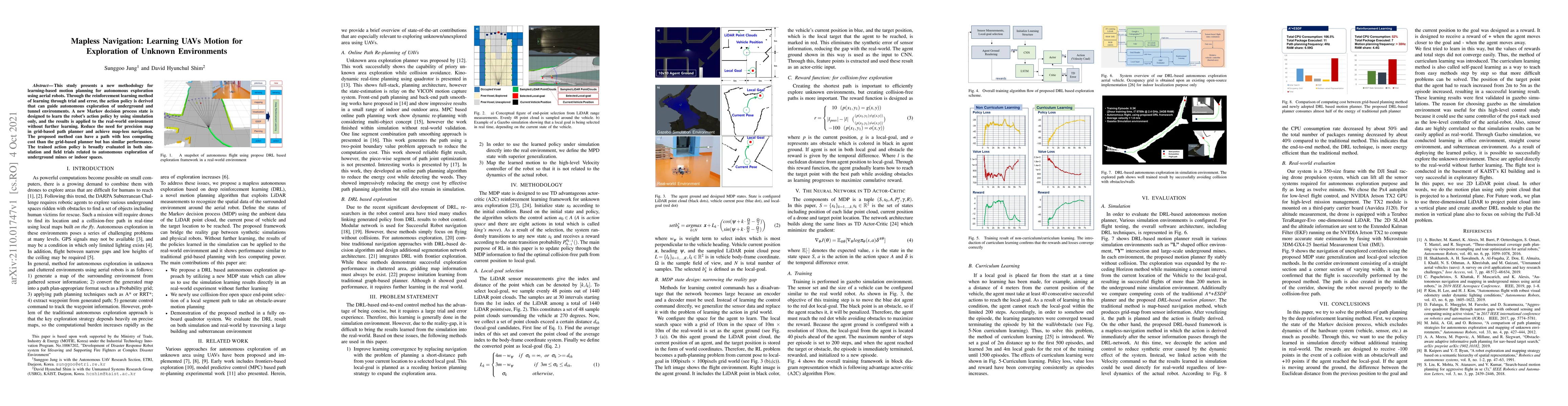 This study presents a new methodology for learning-based motion planning for autonomous exploration using aerial robots. Through the reinforcement learning method of learning through trial and error, the action policy is derived that can guide autonomous exploration of underground and tunnel environments. A new Markov decision process state is designed to learn the robot's action policy by using simulation only, and the results are applied to the real-world environment without further learning. Reduce the need for the precision map in grid-based path planner and achieve map-less navigation. The proposed method can have a path with less computing cost than the grid-based planner but has similar performance. The trained action policy is broadly evaluated in both simulation and field trials related to autonomous exploration of underground mines or indoor spaces.