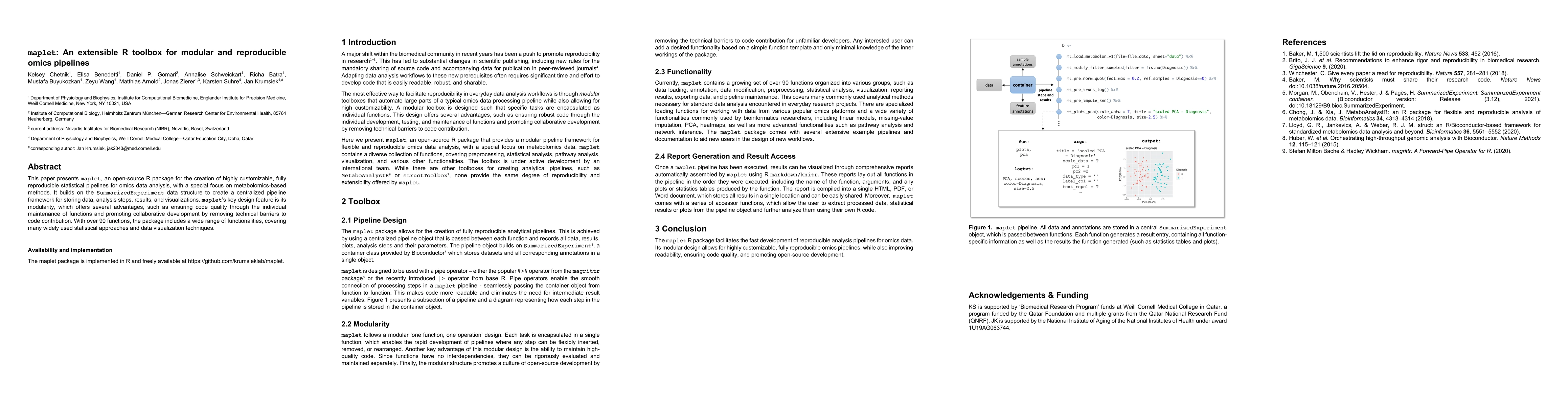 Maplet is an open-source R toolbox for creating customizable, reproducible omics pipelines, particularly for metabolomics. It leverages the SummarizedExperiment data structure to centralize data, analysis, and visualization, emphasizing modularity to enhance code quality and collaborative development.
