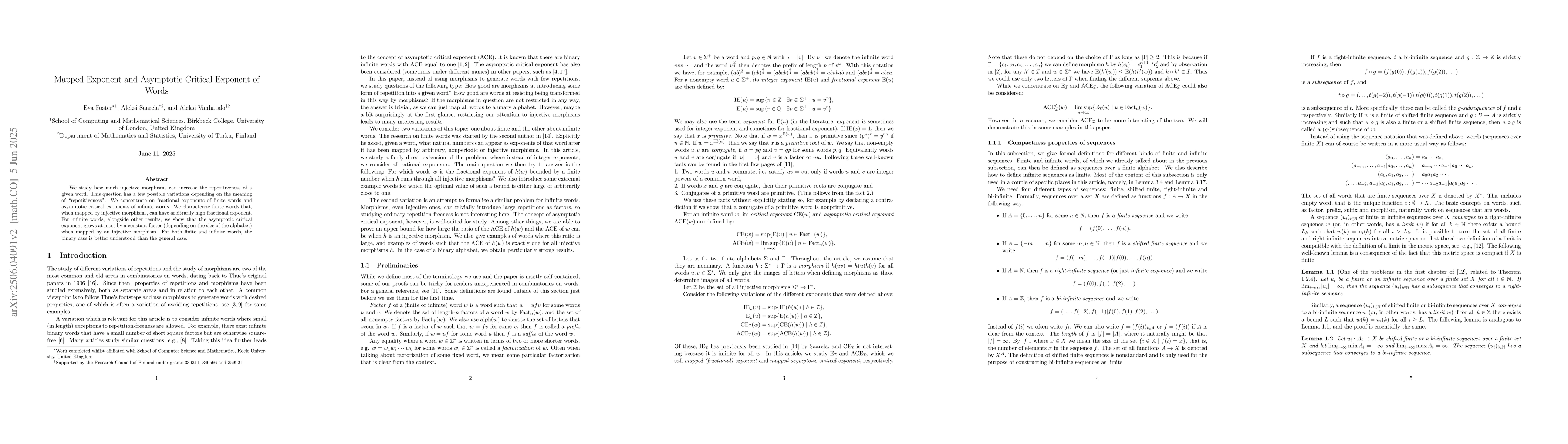 The paper focuses on analyzing the impact of injective morphisms on the repetitiveness of finite words and infinite words, characterizing words with high fractional exponents post-mapping and examining changes in asymptotic critical exponents for infinite words.