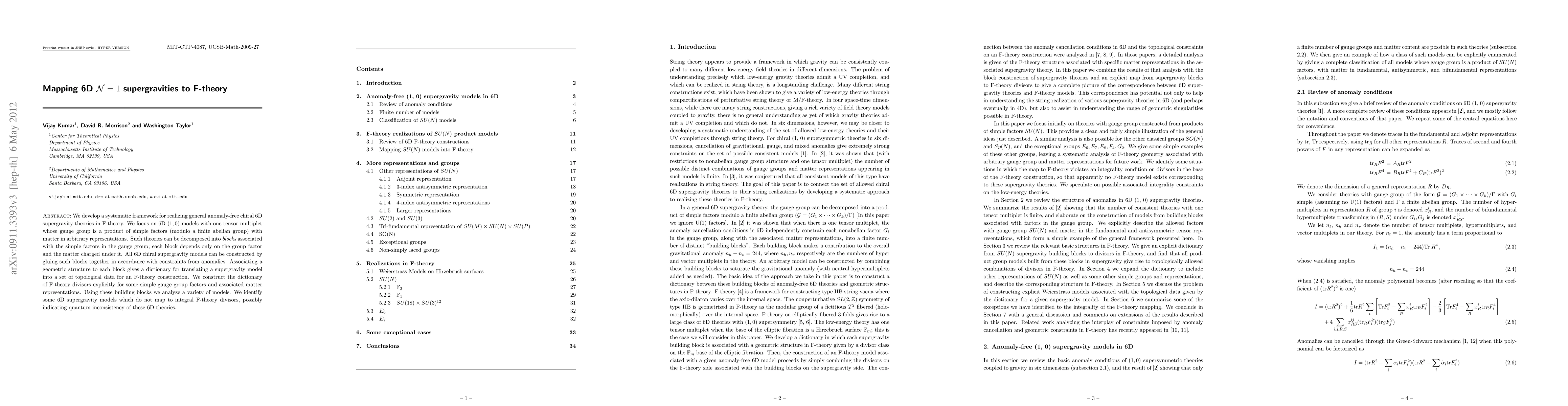 We develop a systematic framework for realizing general anomaly-free chiral 6D supergravity theories in F-theory. We focus on 6D (1, 0) models with one tensor multiplet whose gauge group is a product of simple factors (modulo a finite abelian group) with matter in arbitrary representations. Such theories can be decomposed into blocks associated with the simple factors in the gauge group; each block depends only on the group factor and the matter charged under it. All 6D chiral supergravity models can be constructed by gluing such blocks together in accordance with constraints from anomalies. Associating a geometric structure to each block gives a dictionary for translating a supergravity model into a set of topological data for an F-theory construction. We construct the dictionary of F-theory divisors explicitly for some simple gauge group factors and associated matter representations. Using these building blocks we analyze a variety of models. We identify some 6D supergravity models which do not map to integral F-theory divisors, possibly indicating quantum inconsistency of these 6D theories.