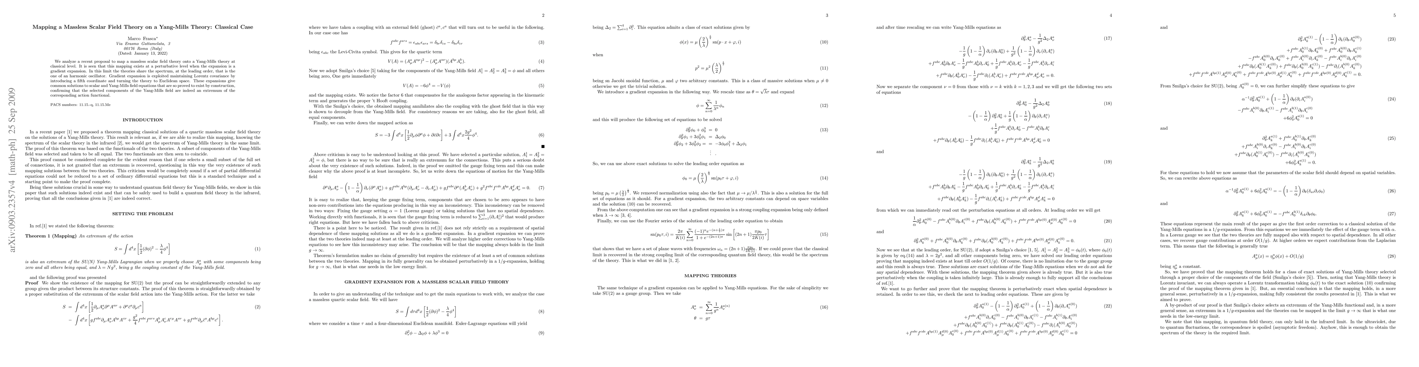 This research demonstrates a classical mapping of a massless scalar field theory onto a Yang-Mills theory via a gradient expansion, preserving Lorentz covariance with a fifth coordinate in Euclidean space. Both theories share an harmonic oscillator spectrum at leading order, confirming shared solutions for field equations in the chosen Yang-Mills field components.