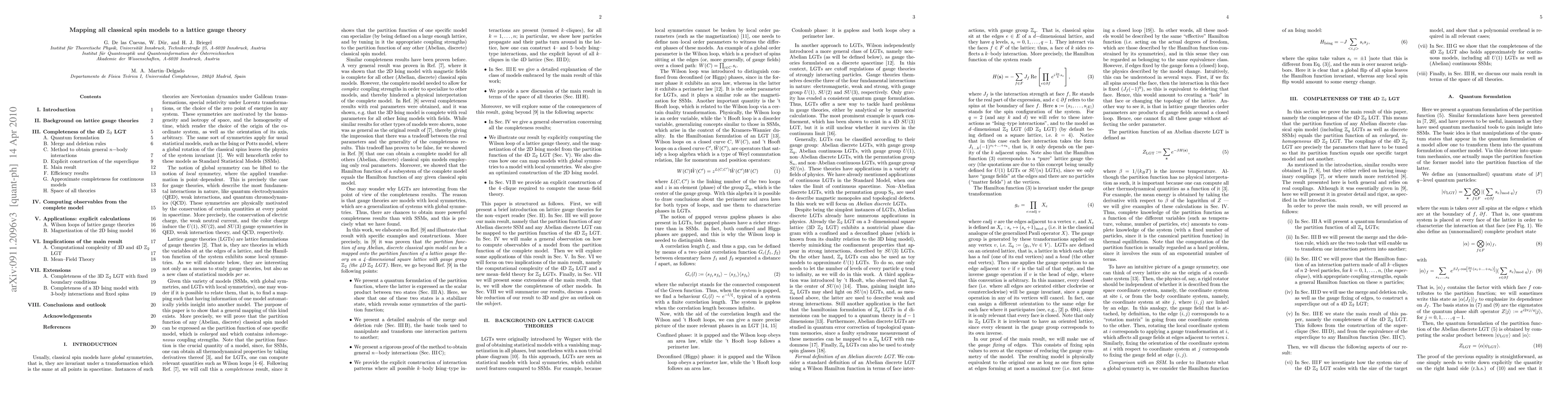 In our recent work [Phys. Rev. Lett. 102, 230502 (2009)] we showed that the partition function of all classical spin models, including all discrete standard statistical models and all Abelian discrete lattice gauge theories (LGTs), can be expressed as a special instance of the partition function of a 4-dimensional pure LGT with gauge group Z_2 (4D Z_2 LGT). This provides a unification of models with apparently very different features into a single complete model. The result uses an equality between the Hamilton function of any classical spin model and the Hamilton function of a model with all possible k-body Ising-type interactions, for all k, which we also prove. Here, we elaborate on the proof of the result, and we illustrate it by computing quantities of a specific model as a function of the partition function of the 4D Z_2 LGT. The result also allows one to establish a new method to compute the mean-field theory of Z_2 LGTs with d > 3, and to show that computing the partition function of the 4D Z_2 LGT is computationally hard (#P hard). The proof uses techniques from quantum information.