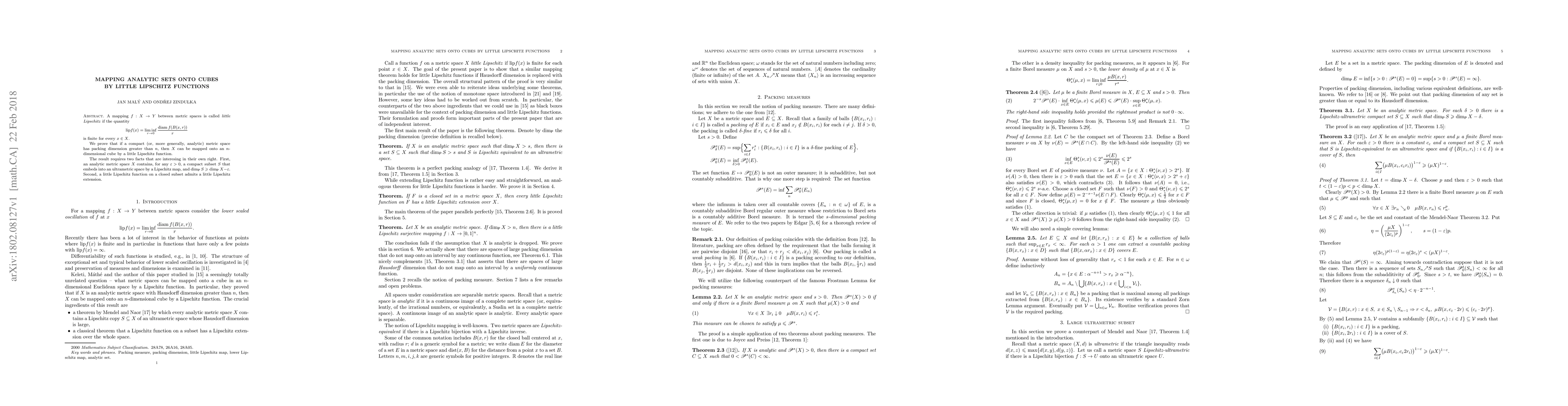 A mapping function can embed an analytic metric space onto a cube if its packing dimension is greater than n, and it's constructed using little Lipschitz functions.