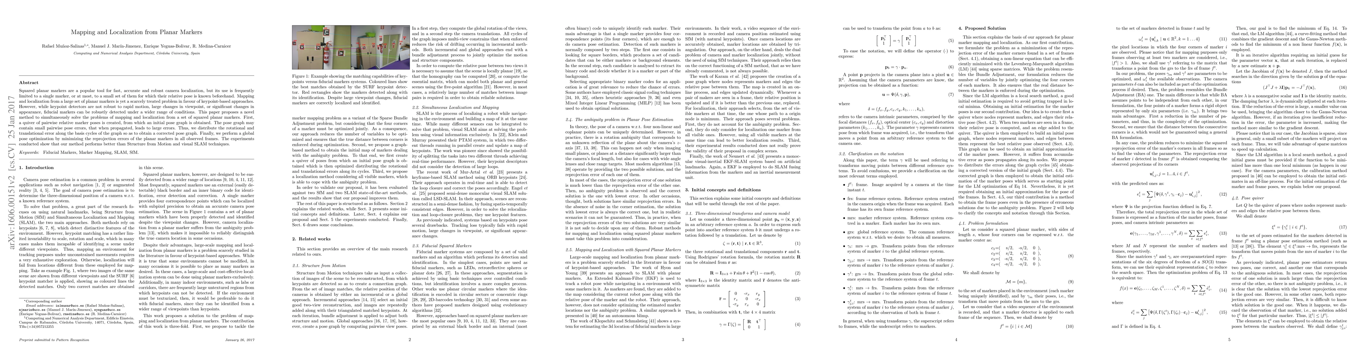 This paper proposes a novel method for mapping and localization using a large set of squared planar markers, addressing the limitations of keypoint-based approaches. It creates a pose graph from pairwise relative marker poses, corrects errors through distributed optimization, and performs global pose optimization to achieve superior performance compared to Structure from Motion and visual SLAM techniques.