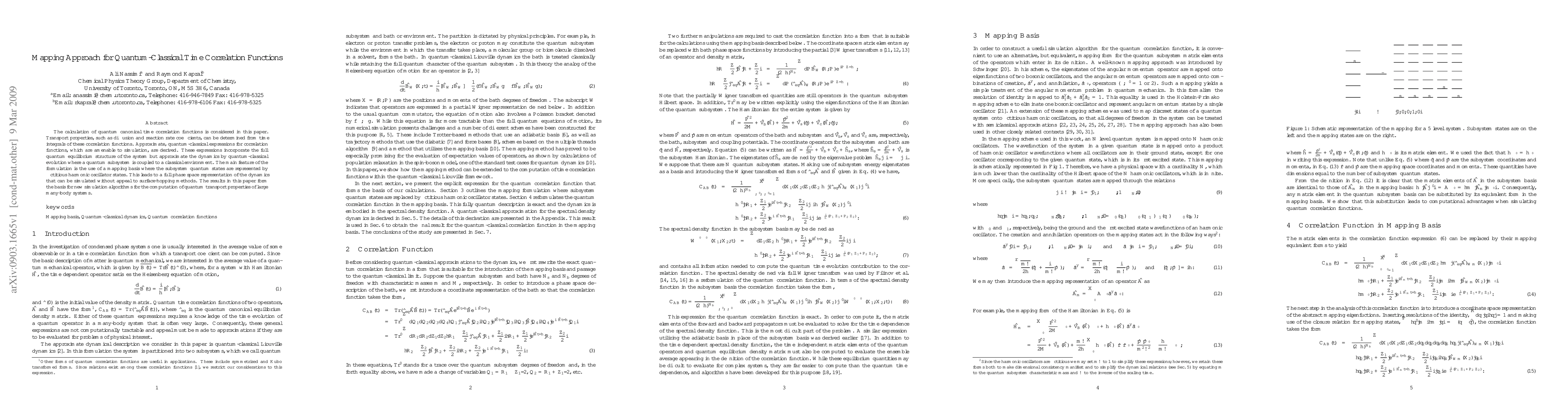 This paper develops a mapping approach to approximate quantum-classical time correlation functions, enabling the simulation of quantum transport properties in large many-body systems without surface-hopping methods, using a basis of fictitious harmonic oscillator states for quantum subsystem representation. The derived expressions incorporate full quantum equilibrium and quantum-classical dynamics.