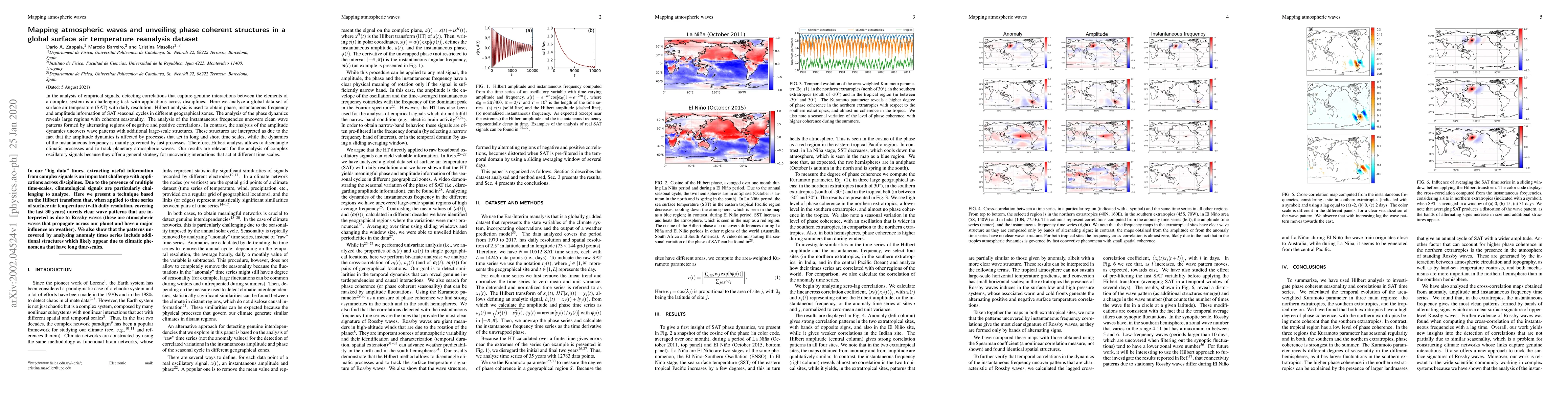 This paper employs Hilbert analysis on a global surface air temperature dataset to identify phase coherent structures and wave patterns. The study reveals coherent seasonality regions and distinct wave patterns in instantaneous frequency and amplitude, highlighting different time scale processes.