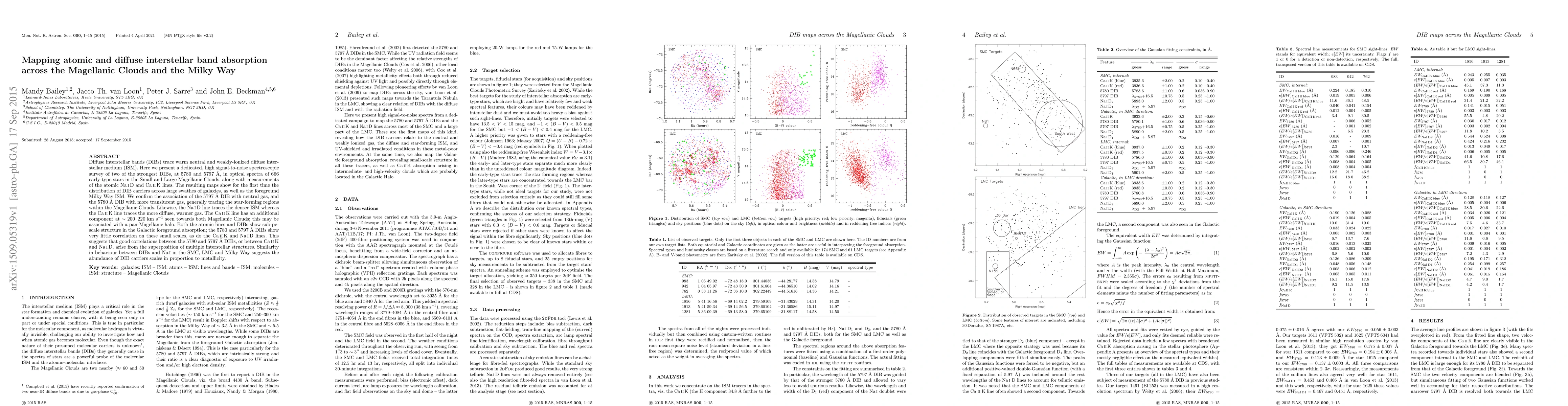 This study maps the distribution of diffuse interstellar bands (DIBs) and atomic lines across the Magellanic Clouds and the Milky Way, revealing the structure of the interstellar medium. The findings suggest that DIBs trace different gas properties, with the 5797 Å DIB linked to neutral gas and the 5780 Å DIB to more translucent, star-forming regions.