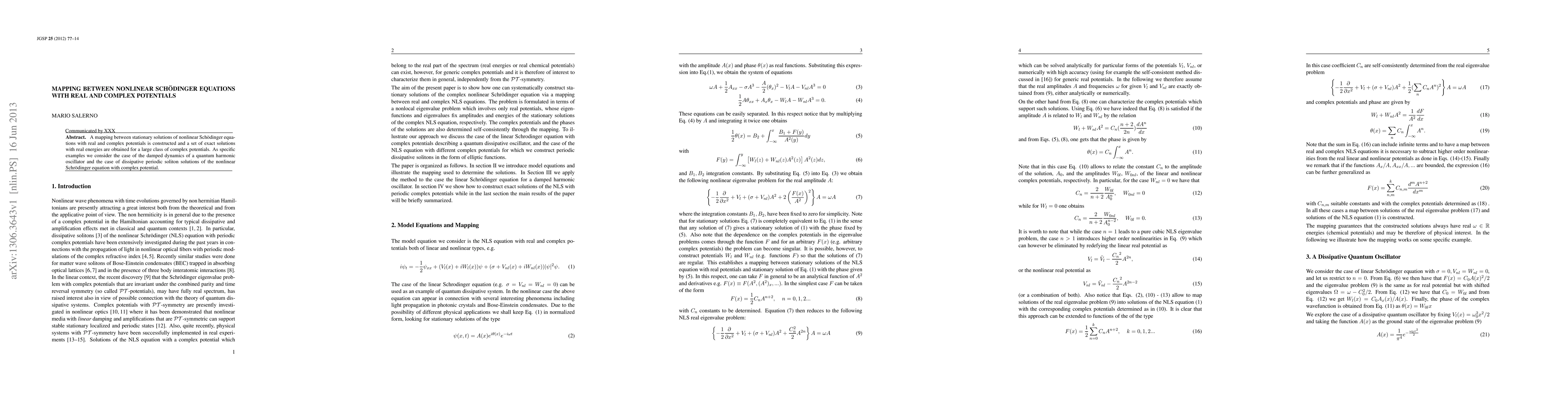 This paper constructs a mapping between stationary solutions of nonlinear Schrödinger equations with real and complex potentials, deriving exact solutions with real energies for a broad class of complex potentials. Specific examples include the damped dynamics of a quantum harmonic oscillator and dissipative periodic soliton solutions.