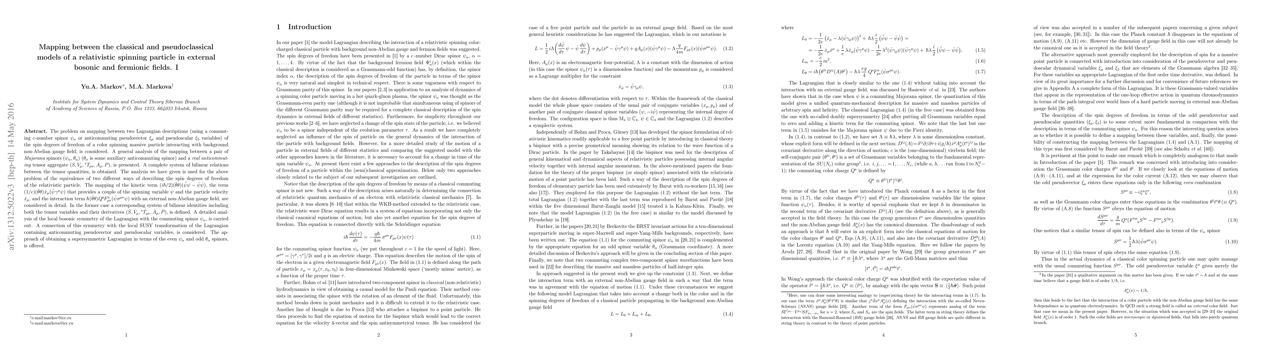 This paper investigates the mapping between two Lagrangian formulations describing the spin degrees of a relativistic particle in external fields: one using a commuting spinor and the other using anticommuting tensors. It establishes a complete set of bilinear relations and analyzes the equivalence between these descriptions, focusing on the kinetic, velocity coupling, and interaction terms.