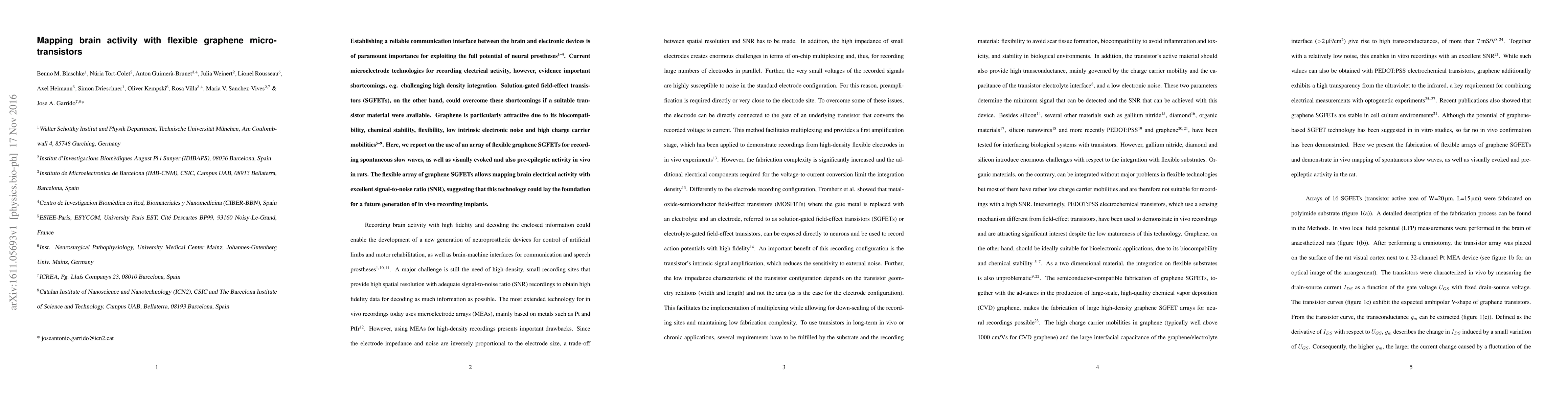This paper explores the use of flexible graphene micro-transistors, specifically solution-gated field-effect transistors (SGFETs), to record brain electrical activity in rats, demonstrating high signal-to-noise ratio and potential for next-generation neural prostheses. The graphene's biocompatibility and flexibility address current limitations in microelectrode technologies.