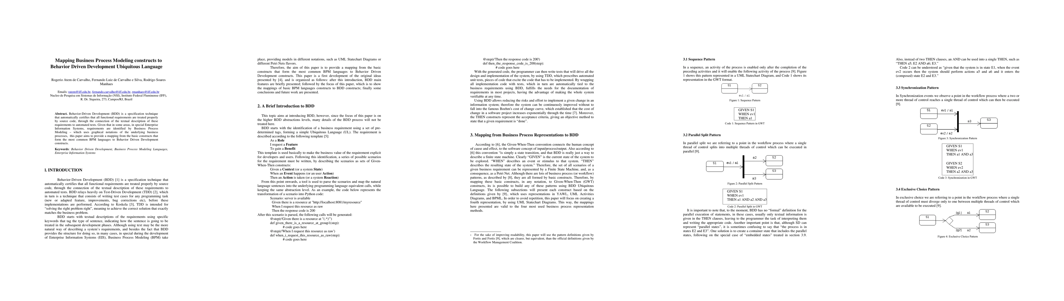 This paper proposes a mapping from Business Process Modeling constructs to Behavior Driven Development (BDD) ubiquitous language, aiming to ensure that functional requirements identified through BPM are properly reflected in BDD-driven automated tests. The goal is to bridge the gap between graphical business process notations and BDD specifications.
