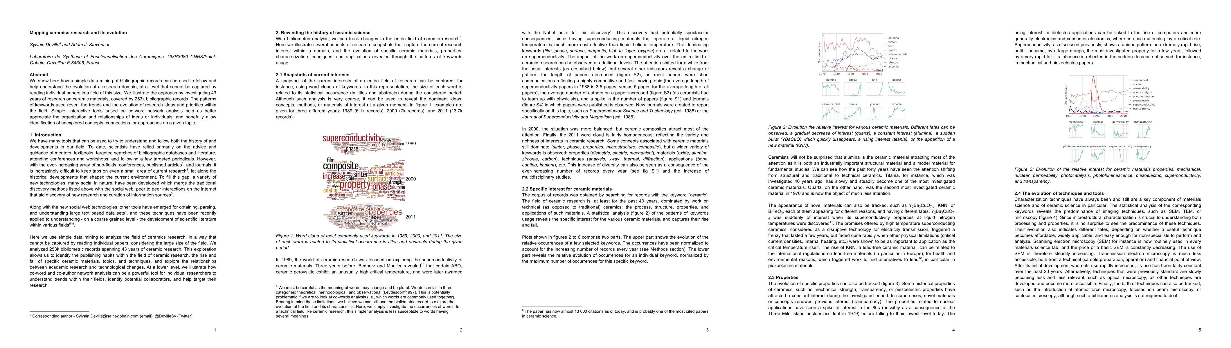 We show here how a simple data mining of bibliographic records can be used to follow and help understand the evolution of a research domain, at a level that cannot be captured by reading individual papers in a field of this size. We illustrate the approach by investigating 43 years of research on ceramic materials, covered by 253k bibliographic records. The patterns of keywords used reveal the trends and the evolution of research ideas and priorities within the field. Simple, interactive tools based on co-word network analysis help us better appreciate the organization and relationships of ideas or individuals, and hopefully allow identification of unexplored concepts, connections, or approaches on a given topic.