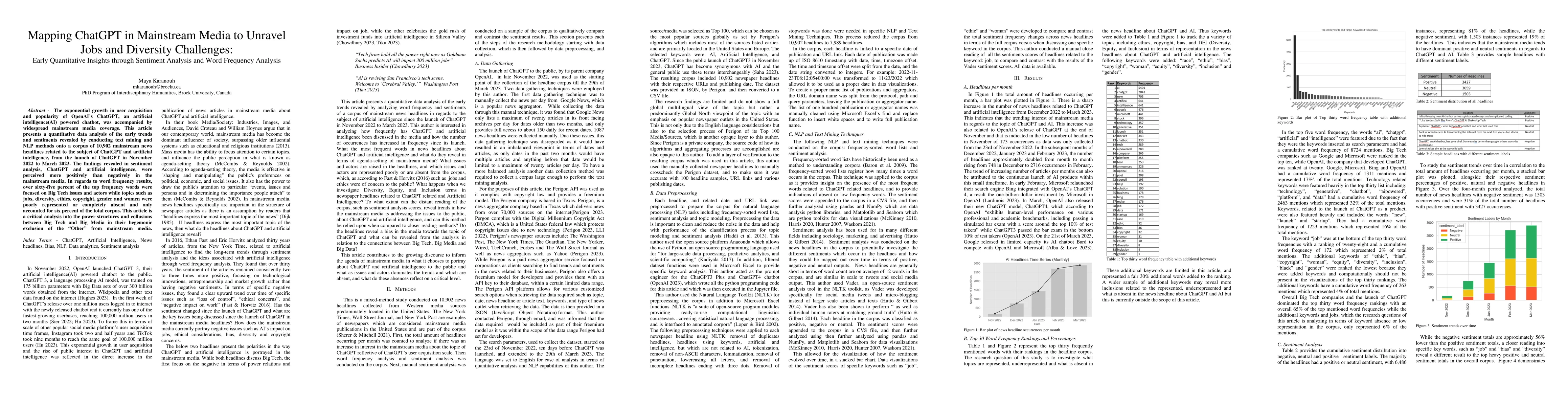 The exponential growth in user acquisition and popularity of OpenAIs ChatGPT, an artificial intelligence(AI) powered chatbot, was accompanied by widespread mainstream media coverage. This article presents a quantitative data analysis of the early trends and sentiments revealed by conducting text mining and NLP methods onto a corpus of 10,902 mainstream news headlines related to the subject of ChatGPT and artificial intelligence, from the launch of ChatGPT in November 2022 to March 2023. The findings revealed in sentiment analysis, ChatGPT and artificial intelligence, were perceived more positively than negatively in the mainstream media. In regards to word frequency results, over sixty-five percent of the top frequency words were focused on Big Tech issues and actors while topics such as jobs, diversity, ethics, copyright, gender and women were poorly represented or completely absent and only accounted for six percent of the total corpus. This article is a critical analysis into the power structures and collusions between Big Tech and Big Media in their hegemonic exclusion of diversity and job challenges from mainstream media.