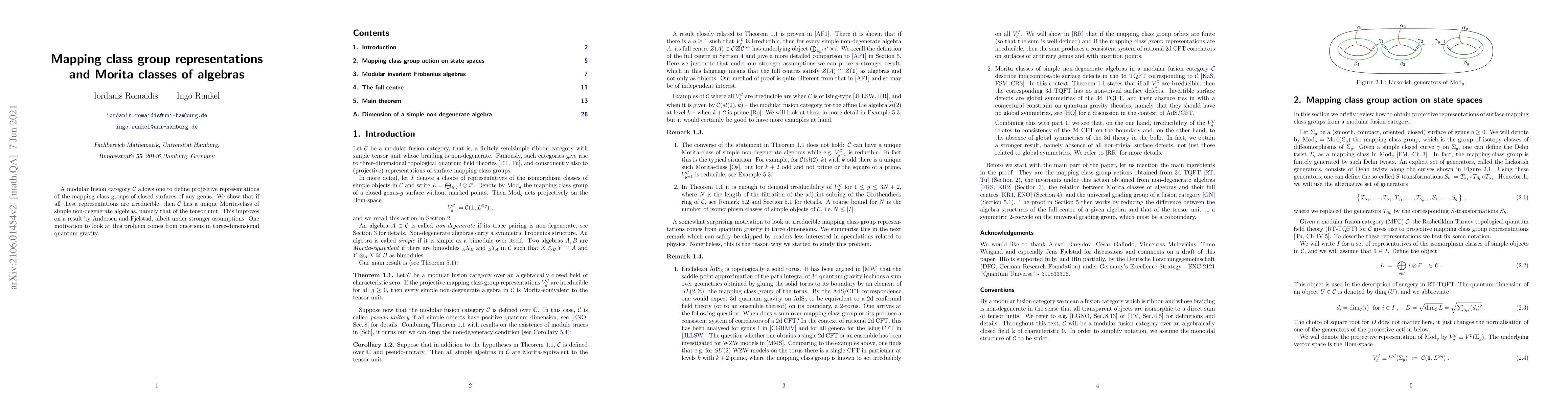 A modular fusion category allows for unique Morita-class simple non-degenerate algebras when mapping class group representations are irreducible, improving on earlier results in three-dimensional quantum gravity.