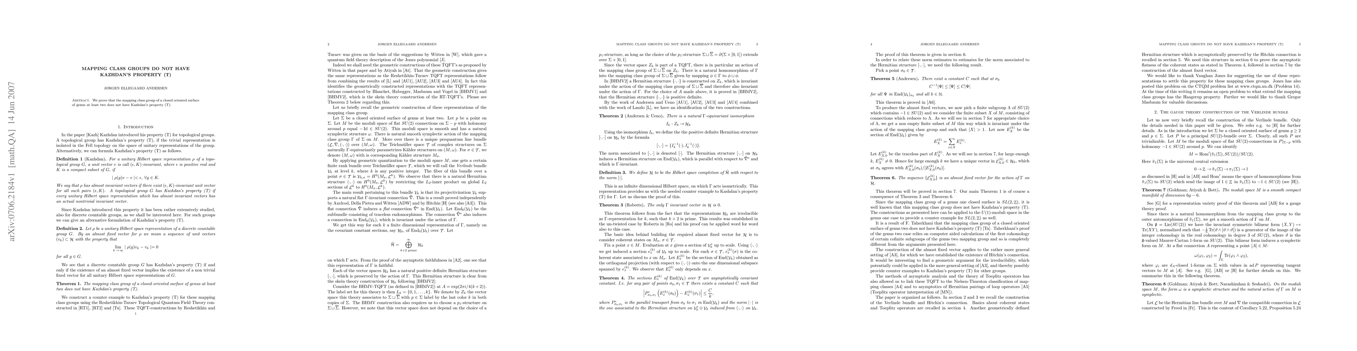 Summary: This paper demonstrates that the mapping class group of a closed oriented surface with genus greater than or equal to two lacks Kazhdan's property (T), which has implications for the group's representation theory.
