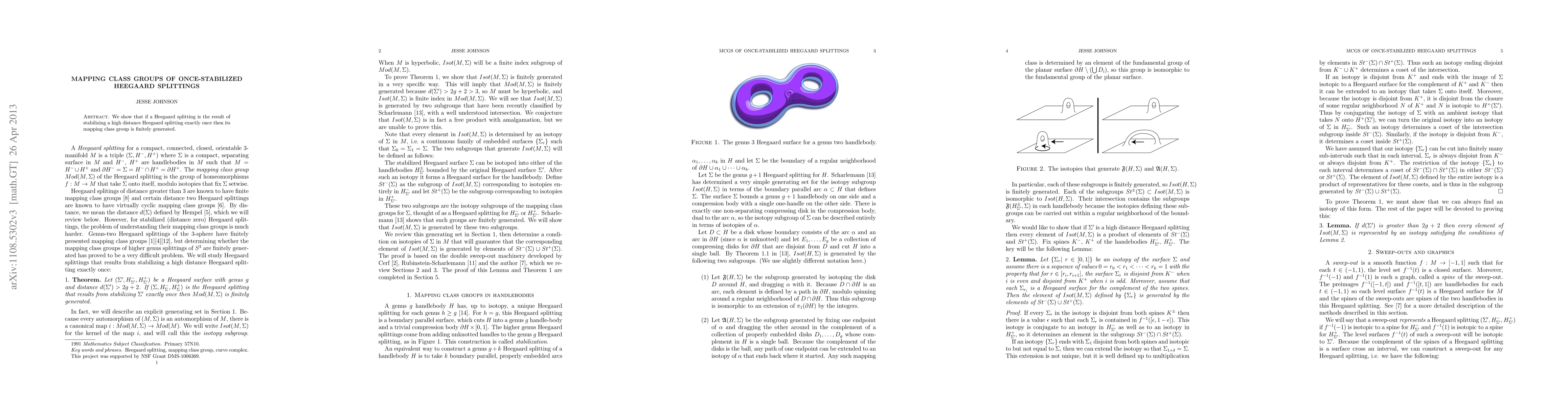 The paper demonstrates that if a Heegaard splitting is obtained by stabilizing a high-distance Heegaard splitting exactly once, its mapping class group is finitely generated. This is achieved by analyzing the behavior of sweep-outs and their associated graphics, and using the concept of bicompressible surfaces in handlebodies.