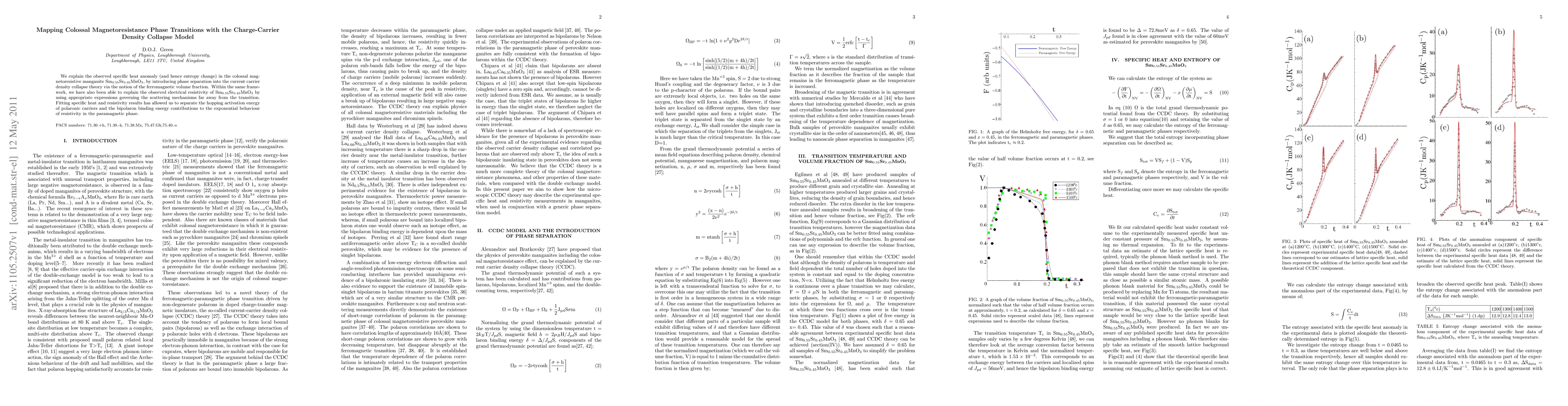 We explain the observed specific heat anomaly (and hence entropy change) in the colossal magnetoresistive manganite Sm0.55Sr0.45MnO3, by introducing phase separation into the current carrier density collapse theory via the notion of the ferromagnetic volume fraction. Within the same framework, we have also been able to explain the observed electrical resistivity of Sm0.55Sr0.45MnO3 by using appropriate expressions governing the scattering mechanisms far away from the transition. Fitting specific heat and resistivity results has allowed us to separate the hopping activation energy of polaronic carriers and the bipolaron binding energy contributions to the exponential behaviour of resistivity in the paramagnetic phase.