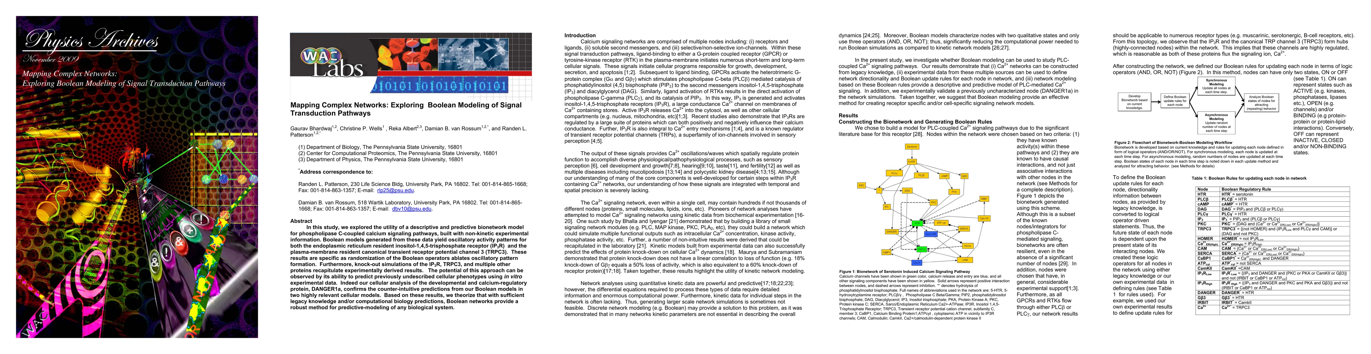 In this study, we explored the utility of a descriptive and predictive bionetwork model for phospholipase C-coupled calcium signaling pathways, built with non-kinetic experimental information. Boolean models generated from these data yield oscillatory activity patterns for both the endoplasmic reticulum resident inositol-1,4,5-trisphosphate receptor (IP3R) and the plasma-membrane resident canonical transient receptor potential channel 3 (TRPC3). These results are specific as randomization of the Boolean operators ablates oscillatory pattern formation. Furthermore, knock-out simulations of the IP3R, TRPC3, and multiple other proteins recapitulate experimentally derived results. The potential of this approach can be observed by its ability to predict previously undescribed cellular phenotypes using in vitro experimental data. Indeed our cellular analysis of the developmental and calcium-regulatory protein, DANGER1a, confirms the counter-intuitive predictions from our Boolean models in two highly relevant cellular models. Based on these results, we theorize that with sufficient legacy knowledge and/or computational biology predictions, Boolean networks provide a robust method for predictive-modeling of any biological system.