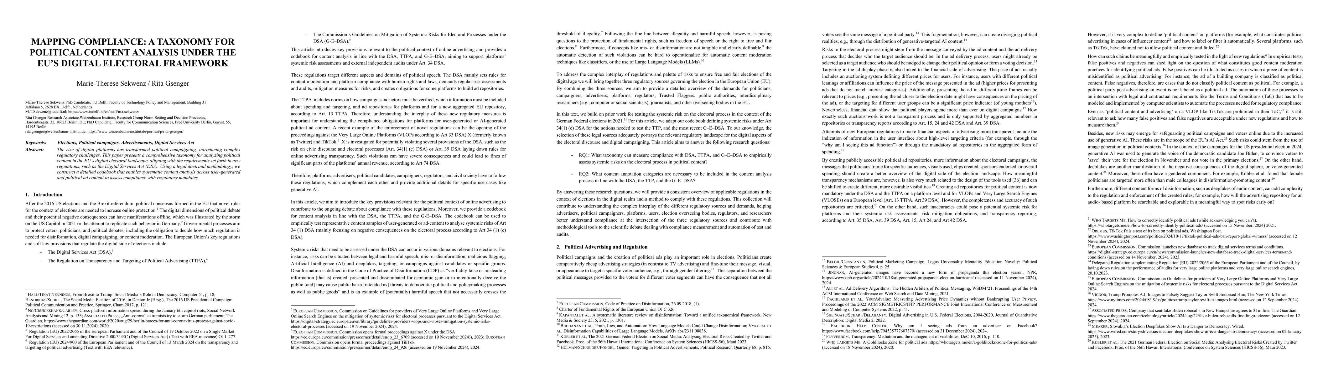 This paper develops a taxonomy for analyzing political content in the EU's digital electoral framework, aligning with the Digital Services Act. It employs a legal doctrinal methodology to create a codebook for systematic compliance assessment of user-generated and political ad content.