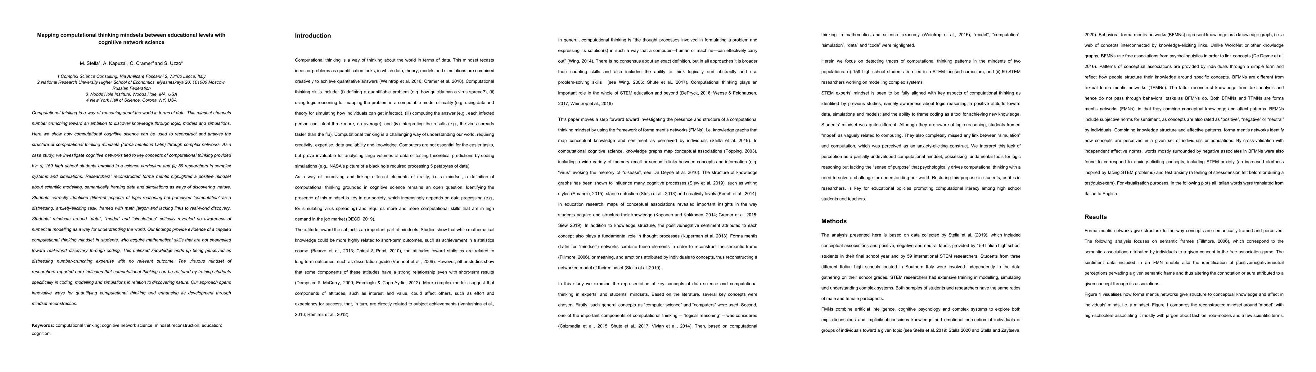 Computational thinking is a way of reasoning about the world in terms of data. This mindset channels number crunching toward an ambition to discover knowledge through logic, models and simulations. Here we show how computational cognitive science can be used to reconstruct and analyse the structure of computational thinking mindsets (forma mentis in Latin) through complex networks. As a case study, we investigate cognitive networks tied to key concepts of computational thinking provided by: (i) 159 high school students enrolled in a science curriculum and (ii) 59 researchers in complex systems and simulations. Researchers' reconstructed forma mentis highlighted a positive mindset about scientific modelling, semantically framing data and simulations as ways of discovering nature. Students correctly identified different aspects of logic reasoning but perceived "computation" as a distressing, anxiety-eliciting task, framed with math jargon and lacking links to real-world discovery. Students' mindsets around "data", "model" and "simulations" critically revealed no awareness of numerical modelling as a way for understanding the world. Our findings provide evidence of a crippled computational thinking mindset in students, who acquire mathematical skills that are not channelled toward real-world discovery through coding. This unlinked knowledge ends up being perceived as distressing number-crunching expertise with no relevant outcome. The virtuous mindset of researchers reported here indicates that computational thinking can be restored by training students specifically in coding, modelling and simulations in relation to discovering nature. Our approach opens innovative ways for quantifying computational thinking and enhancing its development through mindset reconstruction.