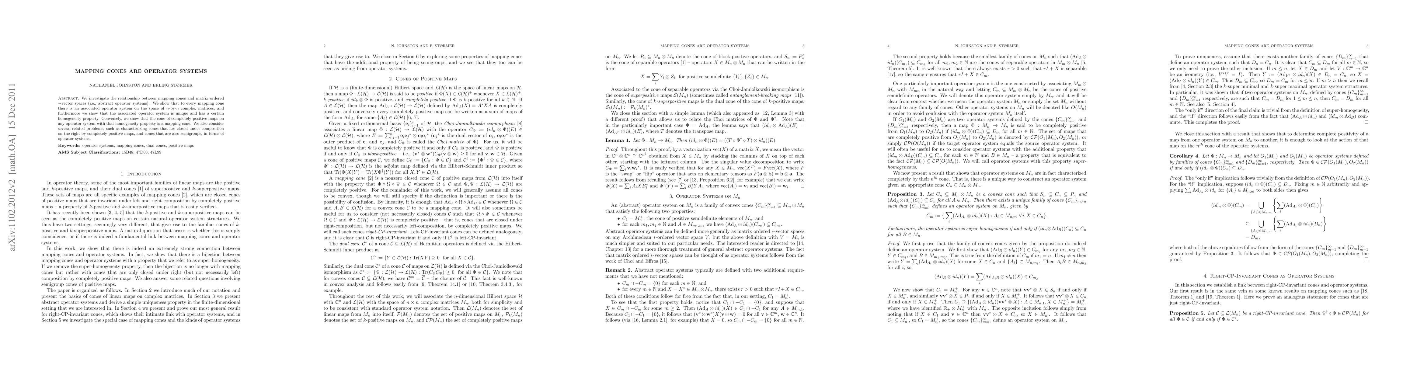We investigate the relationship between mapping cones and matrix ordered *-vector spaces (i.e., abstract operator systems). We show that to every mapping cone there is an associated operator system on the space of n-by-n complex matrices, and furthermore we show that the associated operator system is unique and has a certain homogeneity property. Conversely, we show that the cone of completely positive maps on any operator system with that homogeneity property is a mapping cone. We also consider several related problems, such as characterizing cones that are closed under composition on the right by completely positive maps, and cones that are also semigroups, in terms of operator systems.