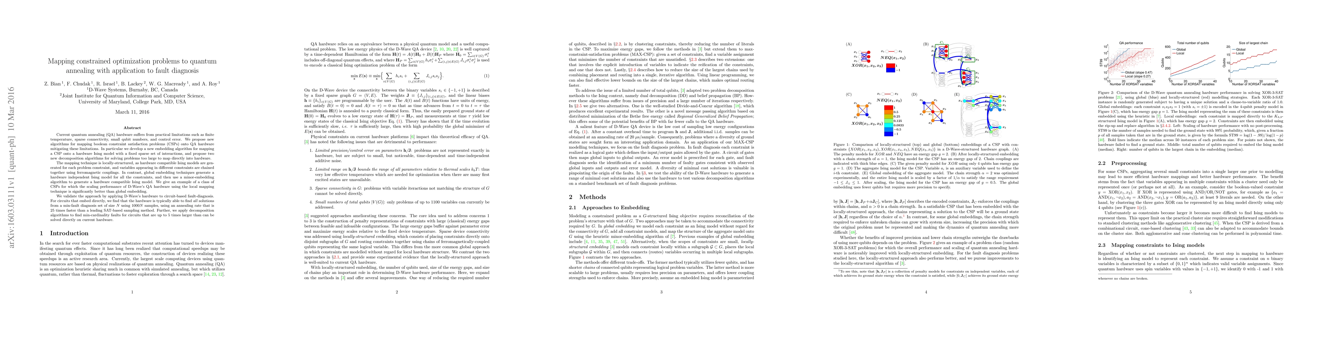 This paper proposes new algorithms to map boolean constraint satisfaction problems onto quantum annealing hardware, addressing practical limitations of current QA systems. The authors introduce a locally-structured embedding technique and decomposition methods for larger problems, demonstrating improved performance in fault diagnosis for circuit-based systems.