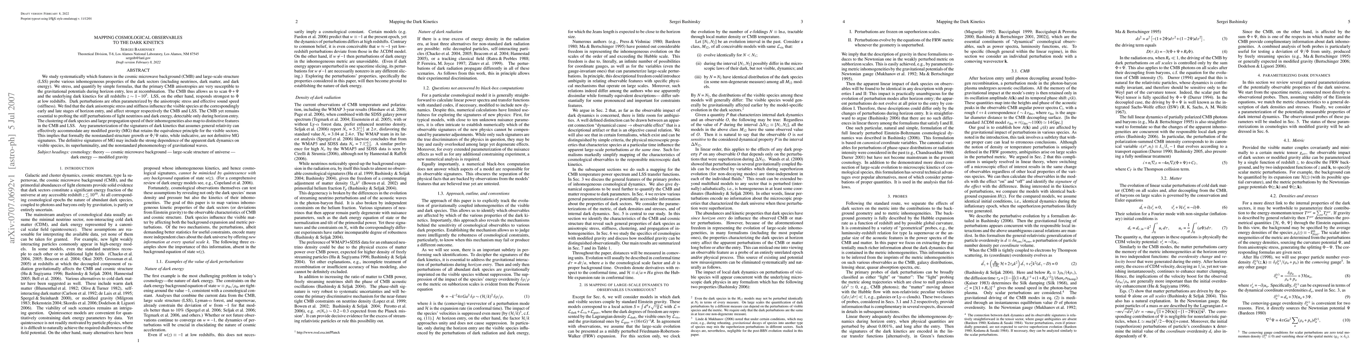 We study systematically which features in the cosmic microwave background (CMB) and large-scale structure (LSS) probe various inhomogeneous properties of the dark sectors (including neutrinos, dark matter, and dark energy). We stress, and quantify by simple formulas, that the primary CMB anisotropies are very susceptible to the gravitational potentials during horizon entry, less at recombination. The CMB thus allows us to scan \Phi+\Psi and the underlying dark kinetics for all redshifts z~1-10^5. LSS, on the other hand, responds strongest to \Phi at low redshifts. Dark perturbations are often parameterized by the anisotropic stress and effective sound speed (stiffness). We find that the dark anisotropic stress and stiffness influence the visible species at the correspondingly early and late stages of horizon entry, and affect stronger respectively the CMB and LSS. The CMB yet remains essential to probing the stiff perturbations of light neutrinos and dark energy, detectable only during horizon entry. The clustering of dark species and large propagation speed of their inhomogeneities also map to distinctive features in the CMB and LSS. -Any parameterization of the signatures of dark kinetics that assumes general relativity can effectively accommodate any modified gravity (MG) that retains the equivalence principle for the visible sectors. This implies that formally the nonstandard structure growth or \Phi/\Psi ratio, while indicative, are not definitive MG signatures. The definitive signatures of MG may include the strong dependence of the apparent dark dynamics on visible species, its superluminality, and the nonstandard phenomenology of gravitational waves.