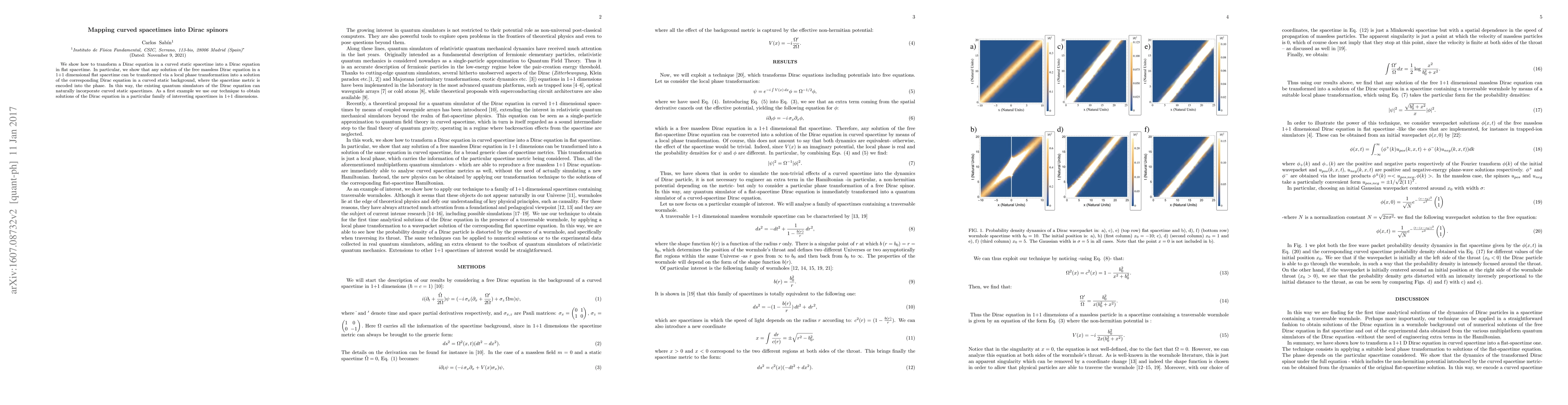This paper demonstrates a method to transform a Dirac equation in curved spacetime into a flat spacetime Dirac equation using a local phase transformation, enabling quantum simulators to incorporate curved spacetimes. As a case study, it applies this technique to solve the Dirac equation in a specific family of 1+1 dimensional curved spacetimes.