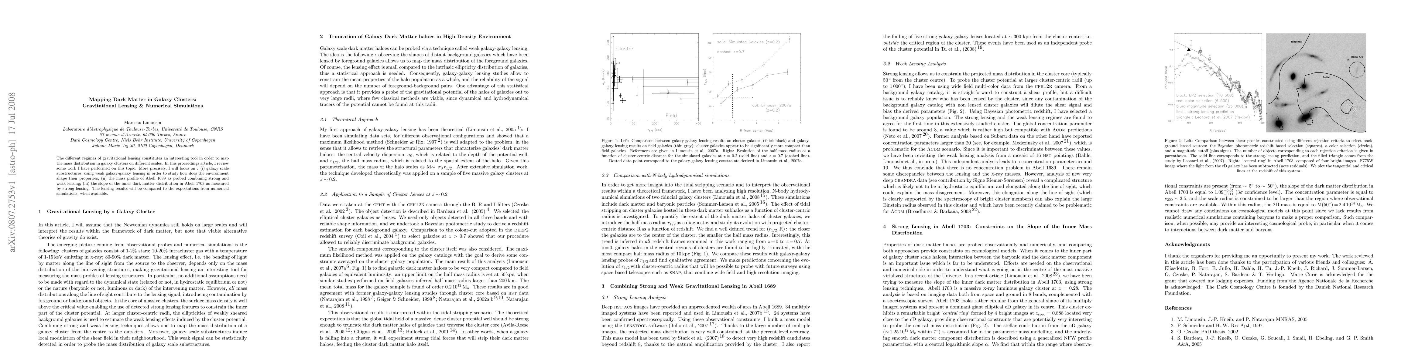 This paper reviews the use of gravitational lensing to map dark matter in galaxy clusters, focusing on galaxy scale substructures, the mass profile of Abell~1689, and the inner dark matter distribution in Abell~1703. Results are compared with numerical simulations to validate findings.