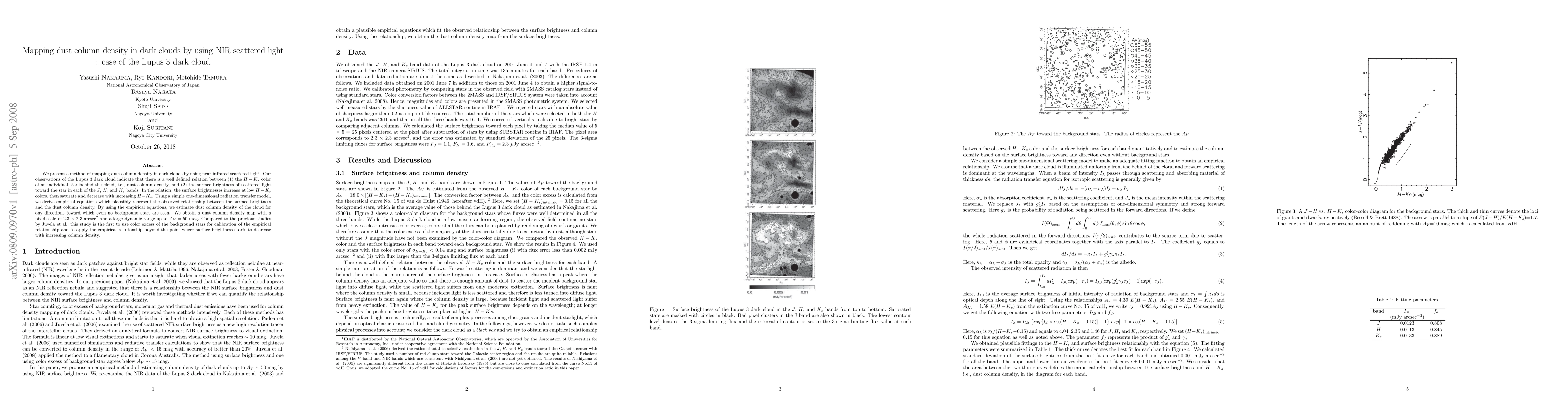 We present a method of mapping dust column density in dark clouds by using near-infrared scattered light. Our observations of the Lupus 3 dark cloud indicate that there is a well defined relation between (1) the H-Ks color of an individual star behind the cloud, i.e., dust column density, and (2) the surface brightness of scattered light toward the star in each of the J, H, and Ks bands. In the relation, the surface brightnesses increase at low H-Ks colors, then saturate and decrease with increasing H-Ks. Using a simple one-dimensional radiation transfer model, we derive empirical equations which plausibly represent the observed relationship between the surface brightness and the dust column density. By using the empirical equations, we estimate dust column density of the cloud for any directions toward which even no background stars are seen. We obtain a dust column density map with a pixel scale of 2.3 x 2.3 arcsec^2 and a large dynamic range up to Av = 50 mag. Compared to the previous studies by Juvela et al., this study is the first to use color excess of the background stars for calibration of the empirical relationship and to apply the empirical relationship beyond the point where surface brightness starts to decrease with increasing column density.