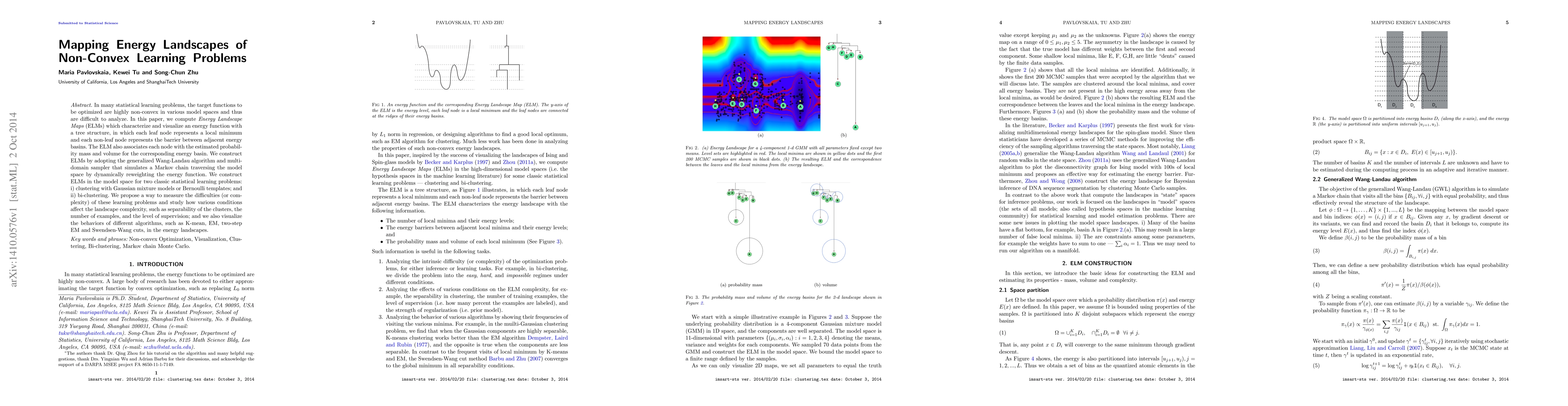 In many statistical learning problems, the target functions to be optimized are highly non-convex in various model spaces and thus are difficult to analyze. In this paper, we compute \emph{Energy Landscape Maps} (ELMs) which characterize and visualize an energy function with a tree structure, in which each leaf node represents a local minimum and each non-leaf node represents the barrier between adjacent energy basins. The ELM also associates each node with the estimated probability mass and volume for the corresponding energy basin. We construct ELMs by adopting the generalized Wang-Landau algorithm and multi-domain sampler that simulates a Markov chain traversing the model space by dynamically reweighting the energy function. We construct ELMs in the model space for two classic statistical learning problems: i) clustering with Gaussian mixture models or Bernoulli templates; and ii) bi-clustering. We propose a way to measure the difficulties (or complexity) of these learning problems and study how various conditions affect the landscape complexity, such as separability of the clusters, the number of examples, and the level of supervision; and we also visualize the behaviors of different algorithms, such as K-mean, EM, two-step EM and Swendsen-Wang cuts, in the energy landscapes.