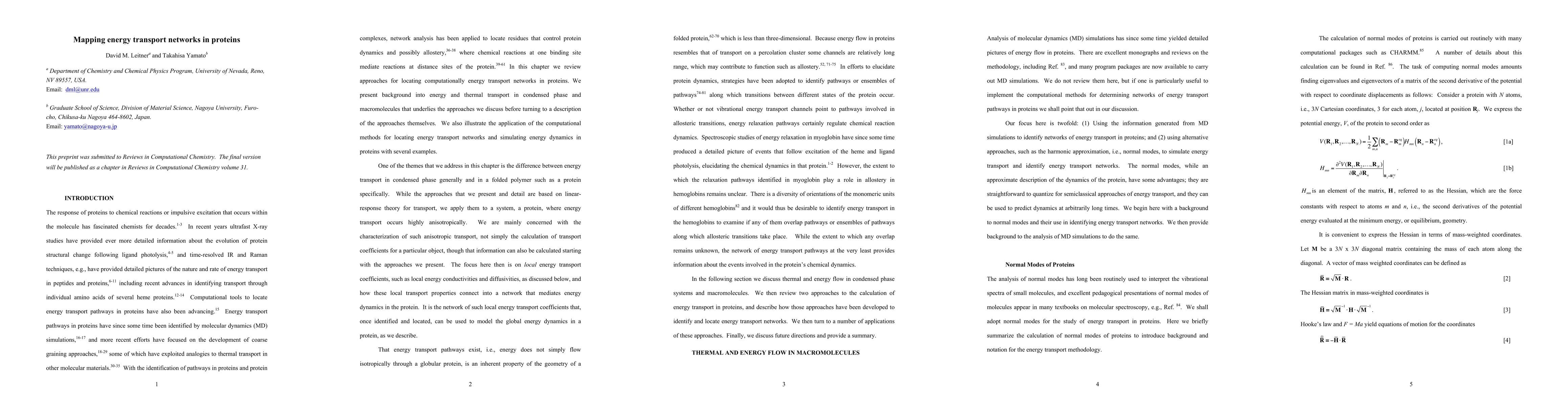 The response of proteins to chemical reactions or impulsive excitation that occurs within the molecule has fascinated chemists for decades. In recent years ultrafast X-ray studies have provided ever more detailed information about the evolution of protein structural change following ligand photolysis, and time-resolved IR and Raman techniques, e.g., have provided detailed pictures of the nature and rate of energy transport in peptides and proteins, including recent advances in identifying transport through individual amino acids of several heme proteins. Computational tools to locate energy transport pathways in proteins have also been advancing. Energy transport pathways in proteins have since some time been identified by molecular dynamics (MD) simulations, and more recent efforts have focused on the development of coarse graining approaches, some of which have exploited analogies to thermal transport in other molecular materials. With the identification of pathways in proteins and protein complexes, network analysis has been applied to locate residues that control protein dynamics and possibly allostery, where chemical reactions at one binding site mediate reactions at distance sites of the protein. In this chapter we review approaches for locating computationally energy transport networks in proteins. We present background into energy and thermal transport in condensed phase and macromolecules that underlies the approaches we discuss before turning to a description of the approaches themselves. We also illustrate the application of the computational methods for locating energy transport networks and simulating energy dynamics in proteins with several examples.