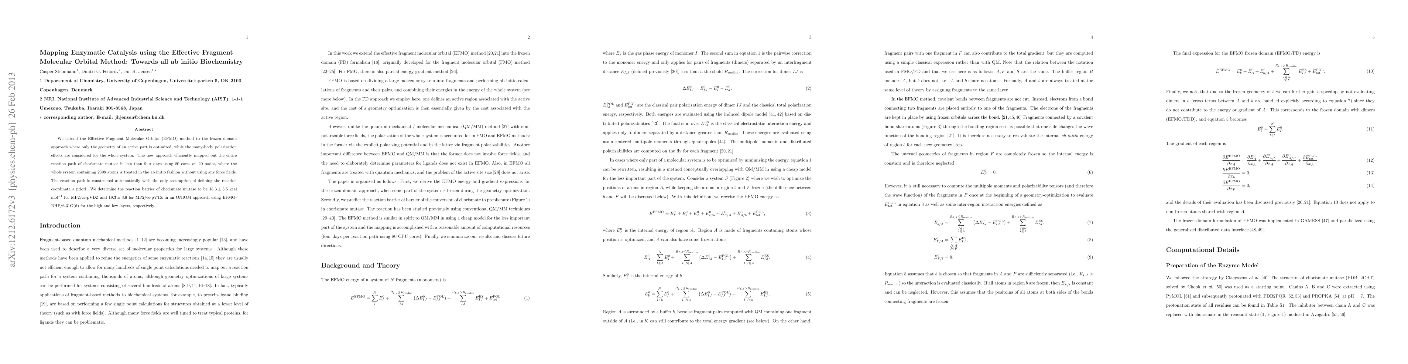 This paper extends the Effective Fragment Molecular Orbital (EFMO) method for enzymatic catalysis, mapping the entire reaction path of chorismate mutase in an ab initio manner, achieving this in less than four days using 80 cores. The reaction barrier is determined to be $18.3\pm 3.5$ kcal mol$^{-1}$ for MP2/cc-pVDZ.