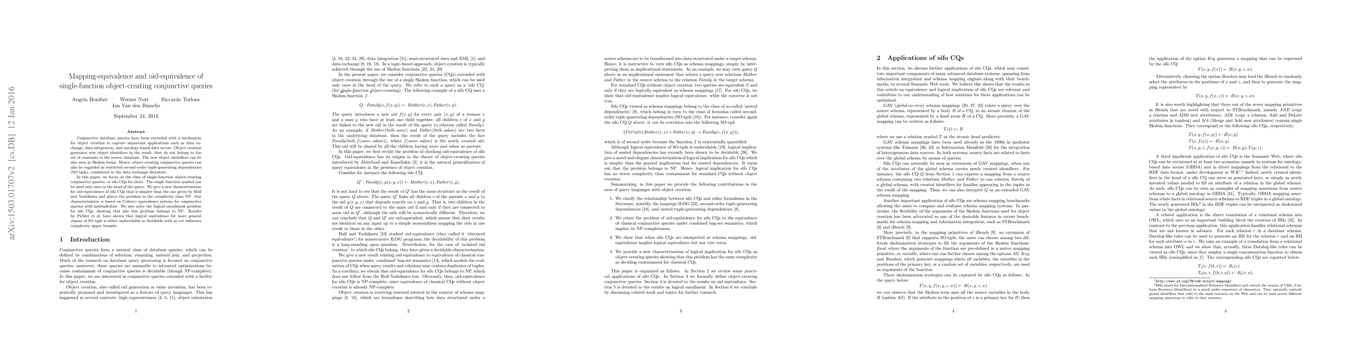 Conjunctive database queries have been extended with a mechanism for object creation to capture important applications such as data exchange, data integration, and ontology-based data access. Object creation generates new object identifiers in the result, that do not belong to the set of constants in the source database. The new object identifiers can be also seen as Skolem terms. Hence, object-creating conjunctive queries can also be regarded as restricted second-order tuple-generating dependencies (SO tgds), considered in the data exchange literature. In this paper, we focus on the class of single-function object-creating conjunctive queries, or sifo CQs for short. We give a new characterization for oid-equivalence of sifo CQs that is simpler than the one given by Hull and Yoshikawa and places the problem in the complexity class NP. Our characterization is based on Cohen's equivalence notions for conjunctive queries with multiplicities. We also solve the logical entailment problem for sifo CQs, showing that also this problem belongs to NP. Results by Pichler et al. have shown that logical equivalence for more general classes of SO tgds is either undecidable or decidable with as yet unknown complexity upper bounds.