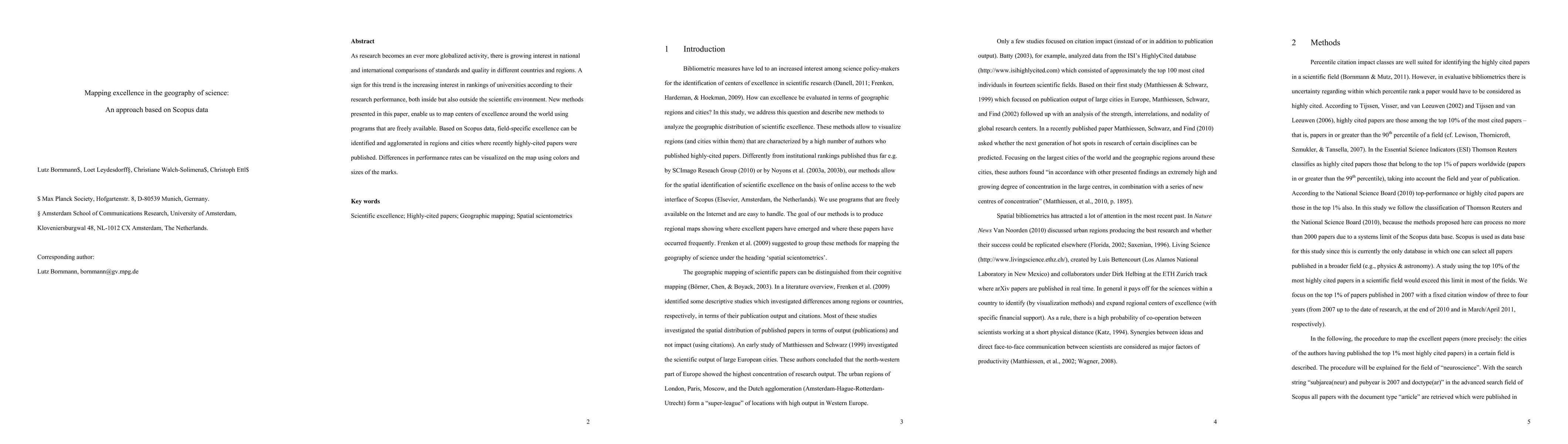 This paper introduces new methods to map global centers of excellence in science using freely available programs based on Scopus data, identifying regions and cities with high-quality, highly-cited research. The approach visualizes performance differences through color-coded and size-scaled markers on a map.