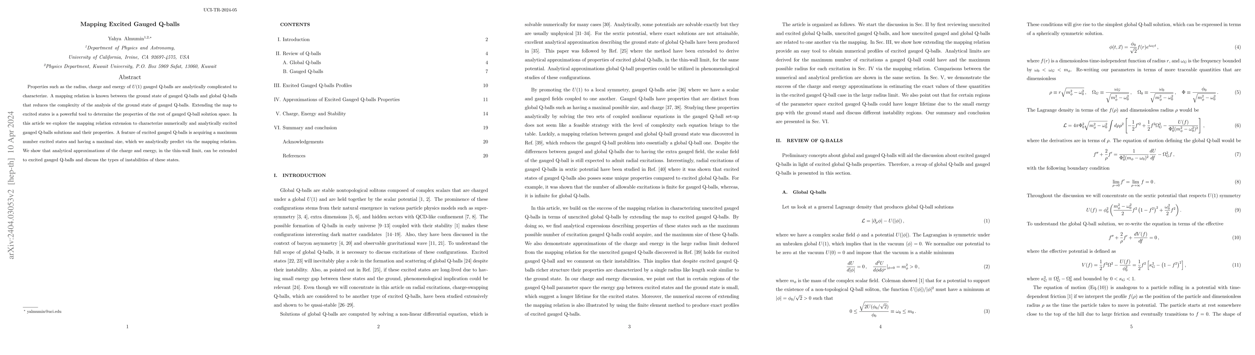 This paper investigates the extension of a known mapping relation to characterize excited gauged Q-balls, providing analytical and numerical insights into their properties, such as radius, charge, and energy, and predicting their maximal size and excited states. It also discusses instabilities in these excited states.