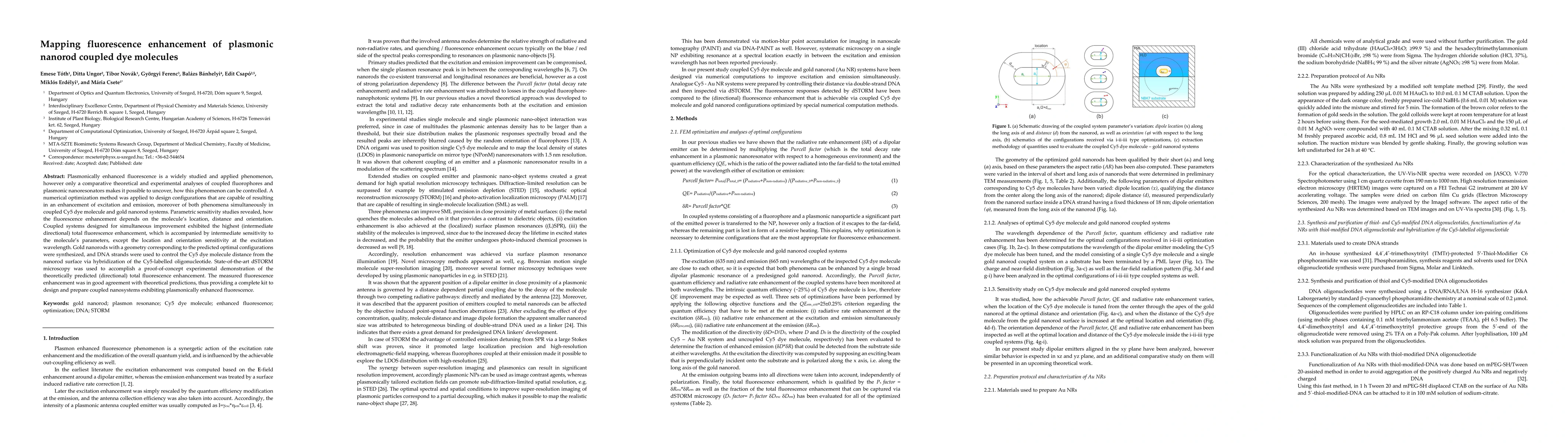 Plasmonically enhanced fluorescence is a widely studied and applied phenomenon, however only a comparative theoretical and experimental analyses of coupled fluorophores and plasmonic nanoresonators makes it possible to uncover, how this phenomenon can be controlled. A numerical optimization method was applied to design configurations that are capable of resulting in an enhancement of excitation and emission, moreover of both phenomena simultaneously in coupled Cy5 dye molecule and gold nanorod systems. Parametric sensitivity studies revealed, how the fluorescence enhancement depends on the molecule's location, distance and orientation. Coupled systems designed for simultaneous improvement exhibited the highest (intermediate directional) total fluorescence enhancement, which is accompanied by intermediate sensitivity to the molecule's parameters, except the location and orientation sensitivity at the excitation wavelength. Gold nanorods with a geometry corresponding to the predicted optimal configurations were synthesized, and DNA strands were used to control the Cy5 dye molecule distance from the nanorod surface via hybridization of the Cy5-labelled oligonucleotide. State-of-the-art dSTORM microscopy was used to accomplish a proof-of-concept experimental demonstration of the theoretically predicted (directional) total fluorescence enhancement. The measured fluorescence enhancement was in good agreement with theoretical predictions, thus providing a complete kit to design and prepare coupled nanosystems exhibiting plasmonically enhanced fluorescence.